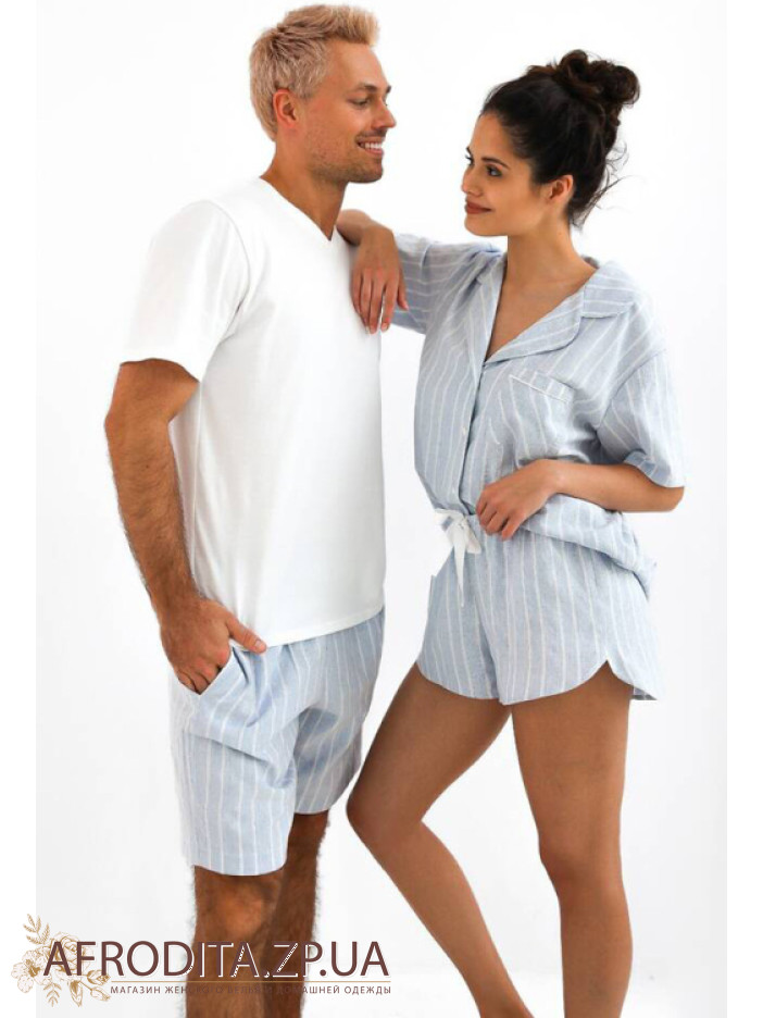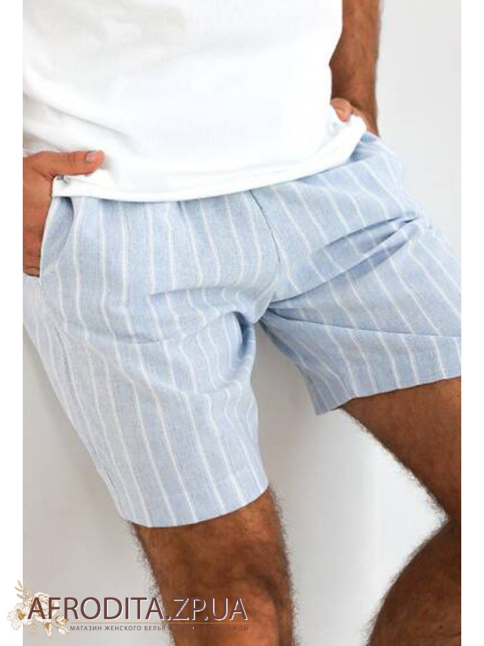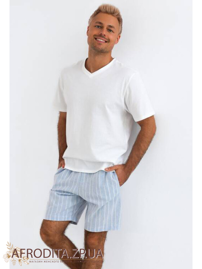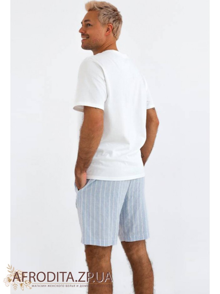Чоловічий комплект із шортами Sensis Edvin із трикотажного полотна на основі бавовни. Комплект складається з білої футболки з короткими рукавами та шорта блакитного кольору в білу смужку, з боків розташовані кишені. Піжама дуже практична і може бути гарною ідеєю для подарунка близькій вам людині.