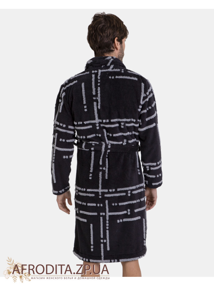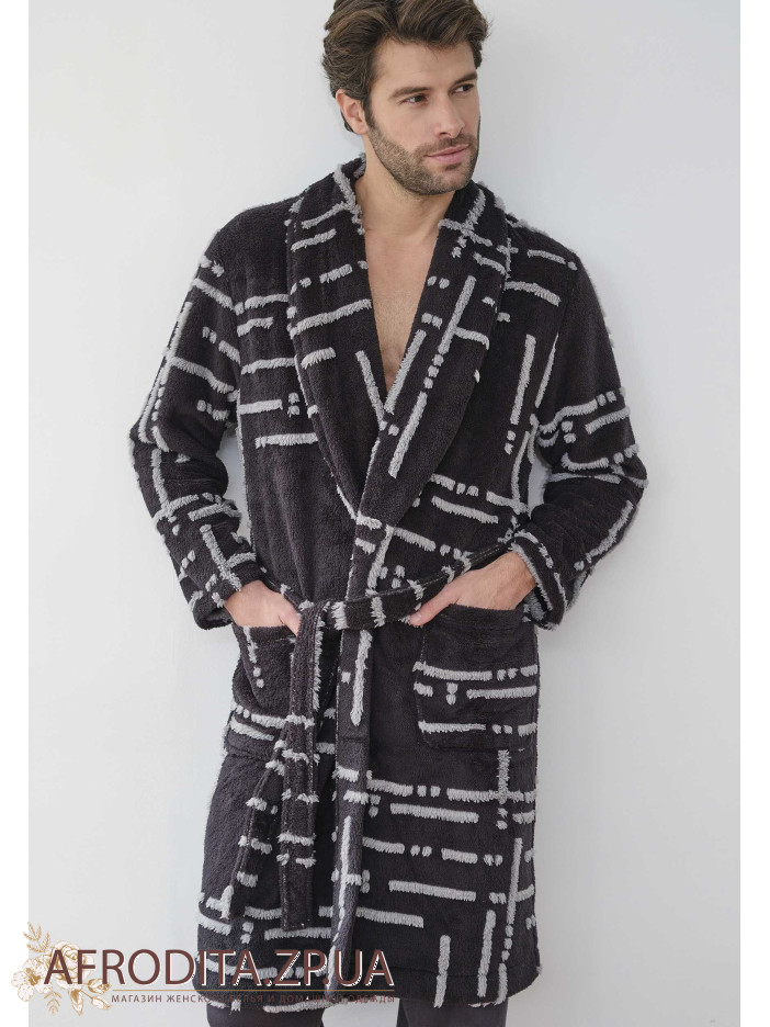 Чоловічий теплий халат Massana L736313 на запах. Халат до колін, з боків розташовані кишені. Лінія талії регулюється поясом.