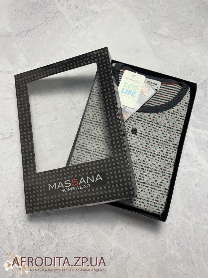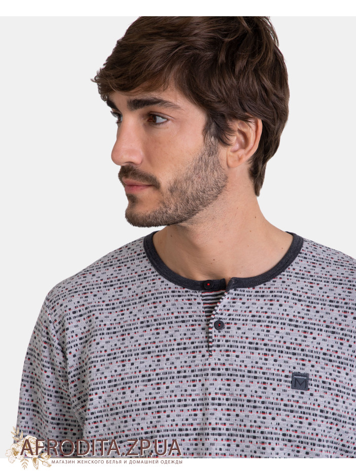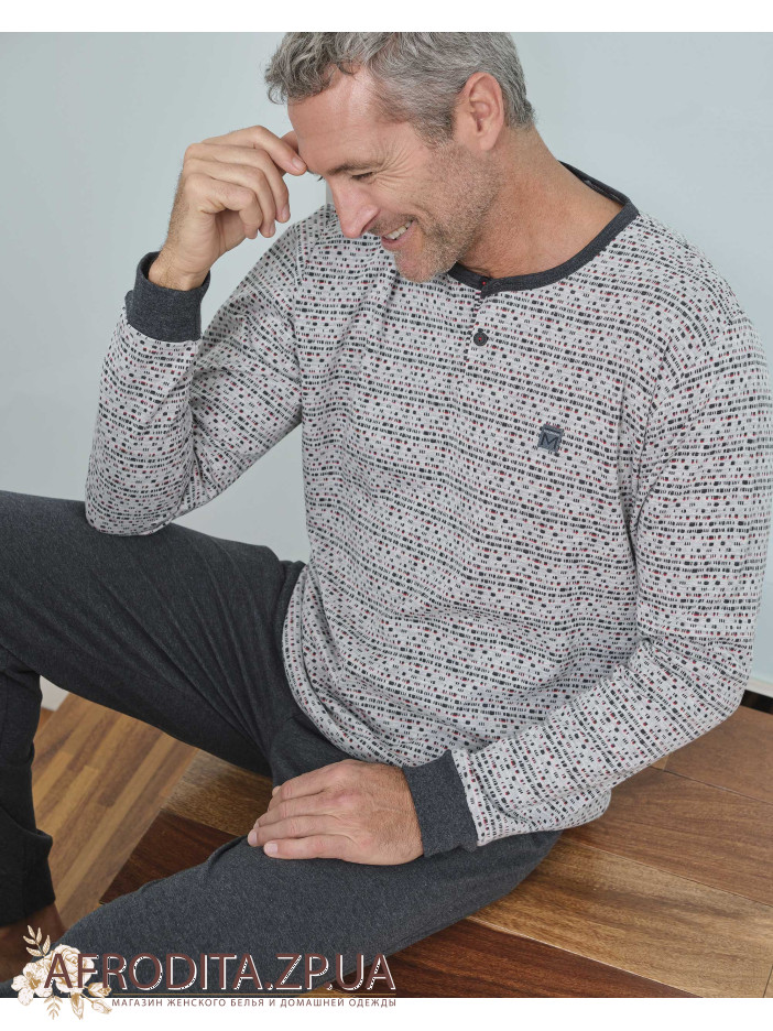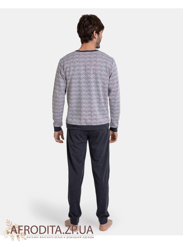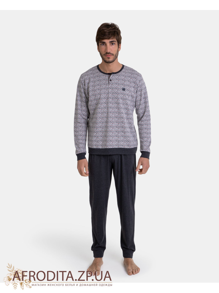 Піжама чоловіча з брюками Massana P731337 виготовлена з бавовняного полотна. Комплект складається з кофти з довгими рукавами, манжети сірого кольору, горловина застібається на гудзики. Штани однотонні прямого крою.