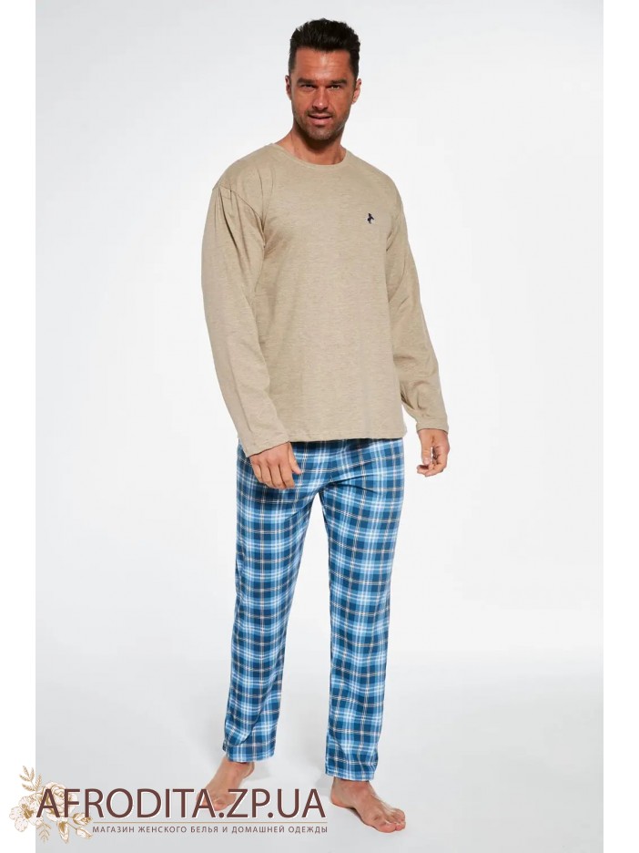 Піжама чоловіча зі штанами 241 Derby виготовлена з трикотажної тканини. Комплект складається з однотонного джемпера бежевого кольору з довгими рукавами та штанів у клітку.