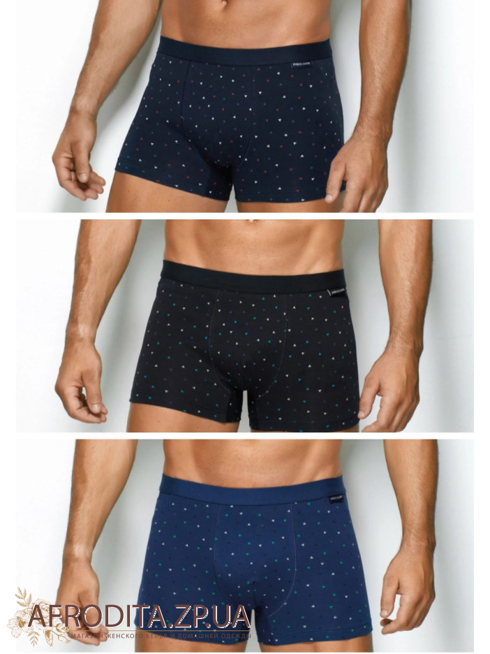Труси чоловічі Enrico Coveri EB1270. Набір з 3 одиниць. Труси чоловічі-боксери з високоякісної бавовняної тканини з додаванням еластану, за рахунок цього не розтягуються та не змінюють форму після прання. Зручна посадка. На поясі широка комфортна гумка з биркою Enrico Coveri. Модель виконана з тканини із дрібним малюнком трикутників. Труси представлені кольором COLORATO, кольору: JEANS, BLU, NERO. Запаковані в окремі оригінальні коробки.
