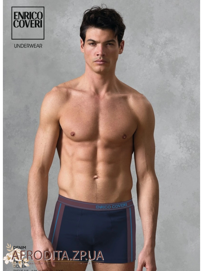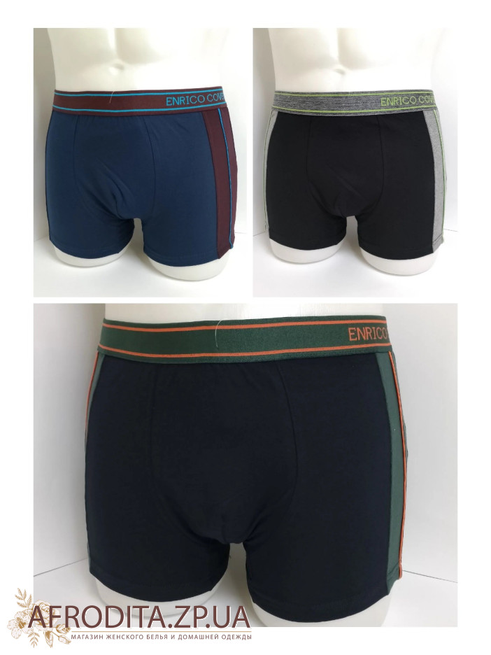 Труси чоловічі-боксери з високоякісної бавовняної тканини з додаванням еластану, за рахунок цього не розтягуються та не змінюють форму після прання. Зручна посадка. Задня частина безшовна. Тканина однотонна, з боків вставки у спортивному стилі з яскравими, контрастними смугами. Пояс також оформлений контрастно, на широкій еластичній гумці з написом ENRICO COVERI.