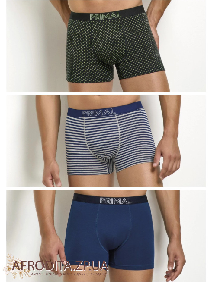 Чоловічі бавовняні труси боксери Primal B340. Набір із 3-х штук в одній упаковці. Пояс на широкій еластичній гумці з написом "PRIMAL". Задня деталь виробу безшовна. Зручна середня посадка. Прилеглий фасон, що дозволяє зробити труси практично непомітними під одягом.