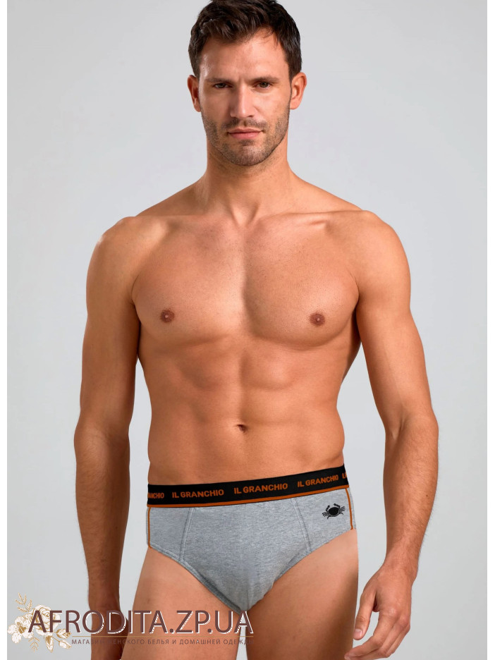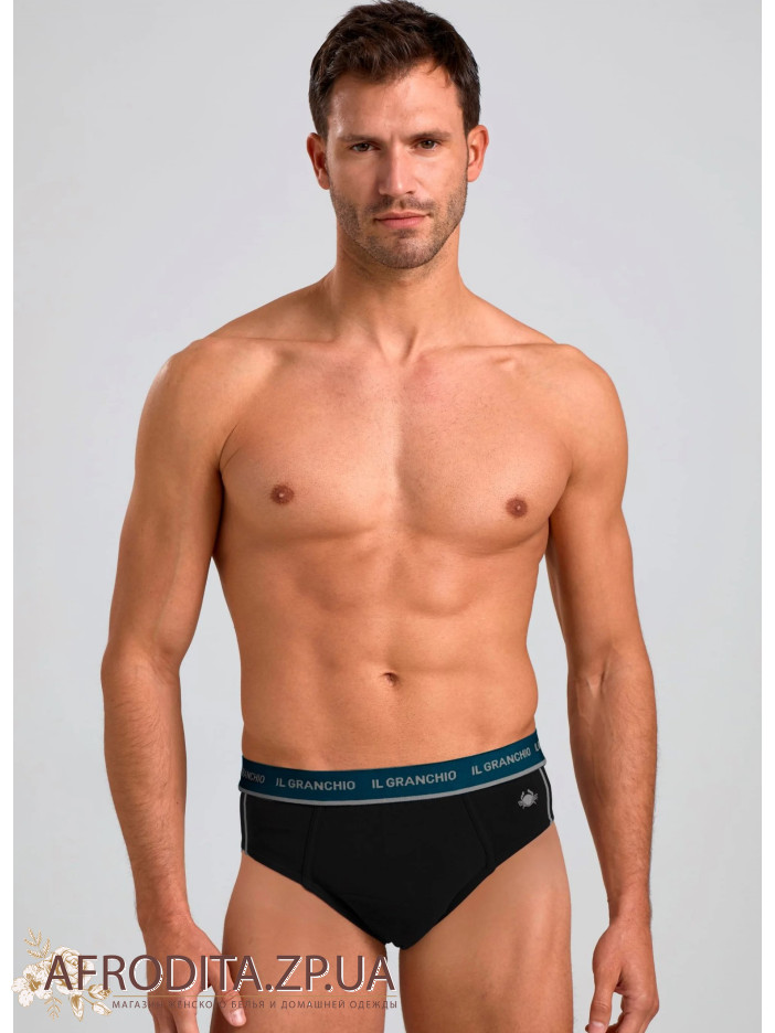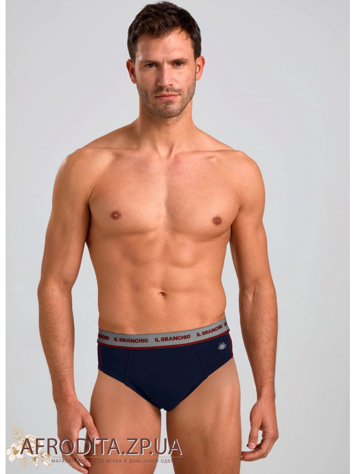 Чоловічі труси-сліпи IL GRANCHIO GS1263 з бавовни з додаванням еластану. Комфортна гумка з написом "IL GRANCHIO" по колу, задня частина безшовна. З боків вертикальні смуги контрастного кольору, спереду ліворуч маленький малюнок краба.