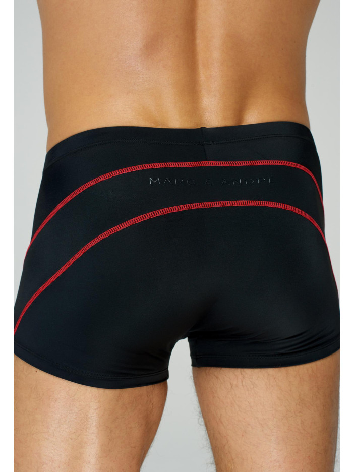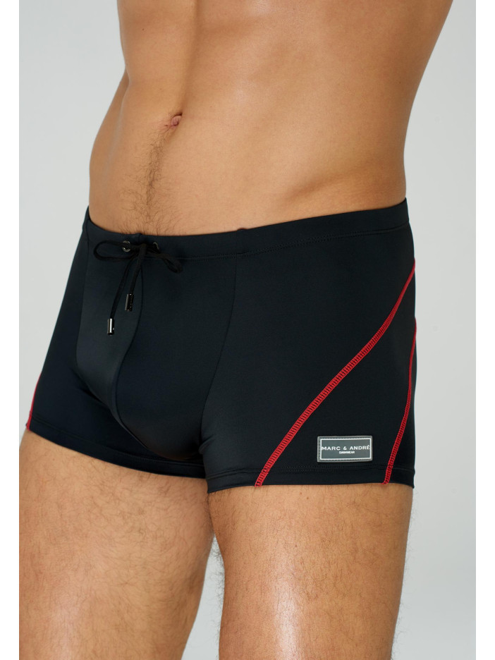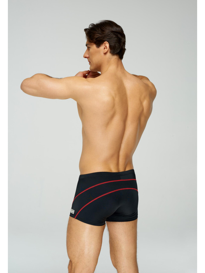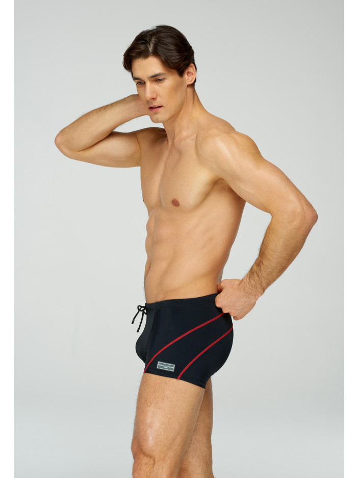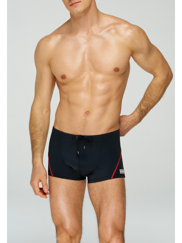 Класичні чоловічі плавки-шорти з яскравими червоними декоративними швами. Ластовиця продубльована м’якою підкладкою для додаткового комфорту та зручності під час плавання.