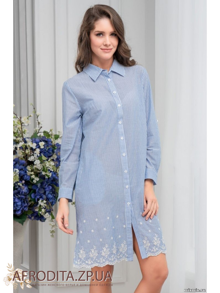 Сорочка-сукня "Ніцца" 6717 від Mia-Amore прямого силуету, довжиною трохи вище лінії колін, з довгим рукавом, виконана з натуральної бавовни в блакитну смужку. Комір відкладний зі стійкою, з боків прорізні кишені в рамку, в бічних швах розрізи. Довжина рукавів регулюється хлястиком. На спинці кокетка. Низ сорочки оздоблений вишивкою молочного кольору.