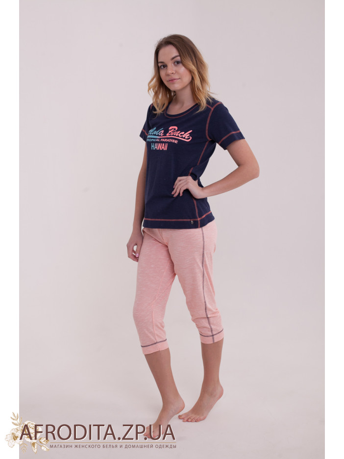 Комфортний комплект з бриджами "Rebelle" 2181-260-2 (Голландія) підходить як для дому так і в якості пляжного одягу. Комплект складається з футболки темно-синього кольору з написом і бриджі ніжно-рожевого кольору. Склад: Бавовна 80% поліестер 20%.