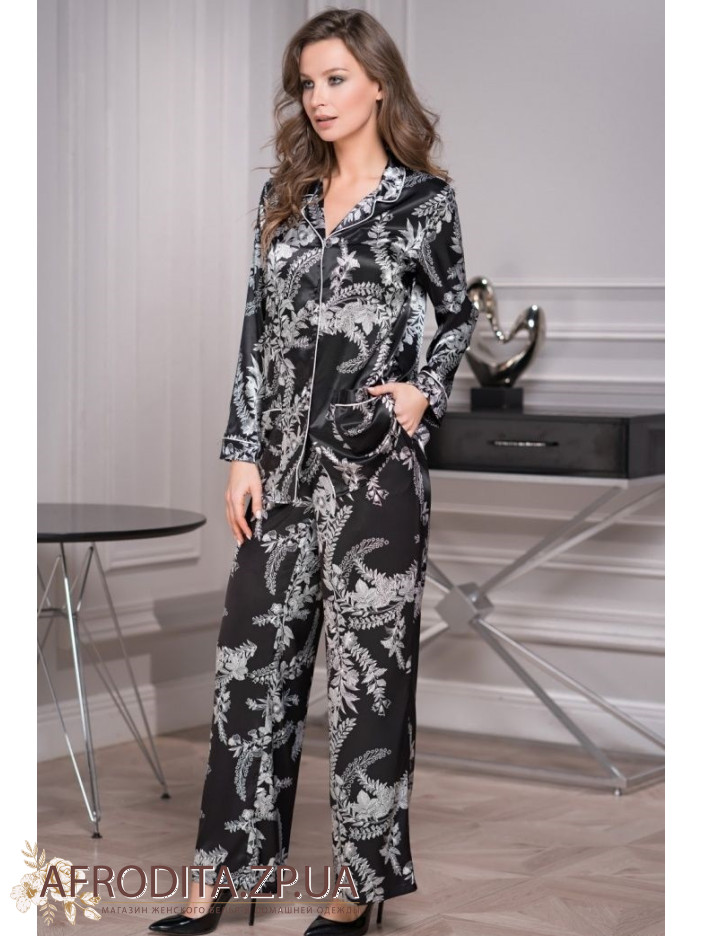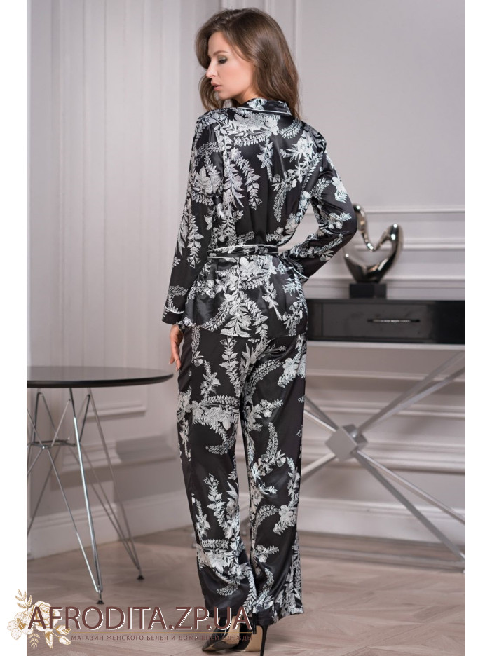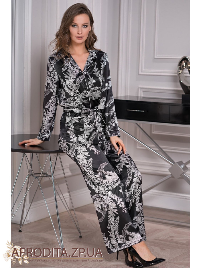 Брючний комплект вільного крою "Міріам" 3486 з білим рослинним принтом на чорному тлі від італійського бренду Mia-Amore, виготовлений з натурального шовку. Комплект складається з сорочки на гудзиках з довгим рукавом, з боків розташовані кишені, штани прямого крою на резинці в області талії. У комплекті надається пояс. Піжама виглядає дуже елегантно. Відмінна ідея для подарунка близькій вам людині.