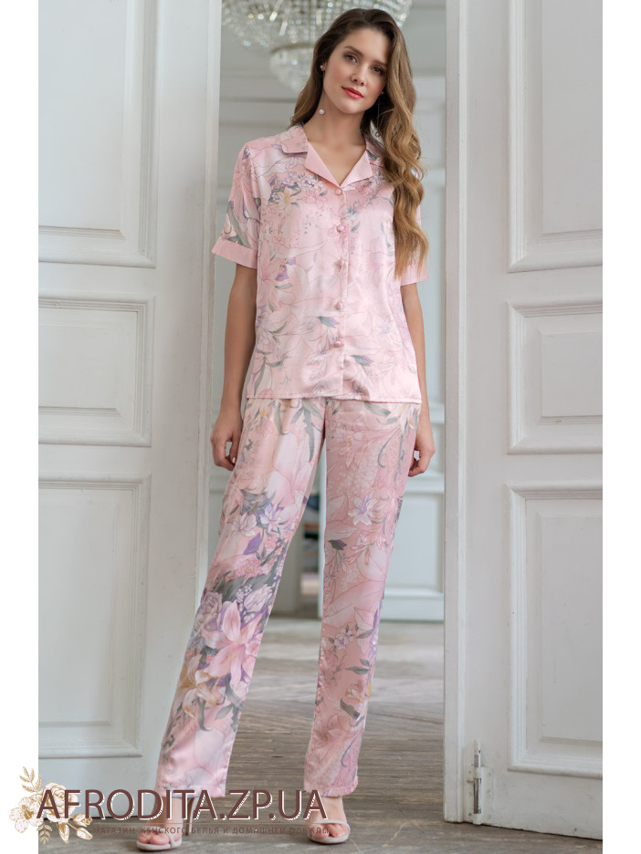 Домашній брючний комплект "Едем" 5975 від італійського бренду Mia-Amore з натурального шовку в перлинно-рожевих тонах. Ефект 3D малюнка надає неповторну родзинку. Комплект складається з сорочки на гудзиках і брюк з боковими кишенями.