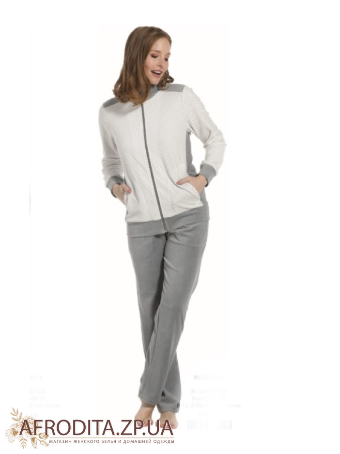 Домашній жіночий комплект "Pastunette" 80202-141-8 (Голландія). Комплект складається з кофти з довгим рукавом, з боків розташовані кишені. Джемпер застібається на блискавку. Штани однотонні сірого кольору прямого крою.