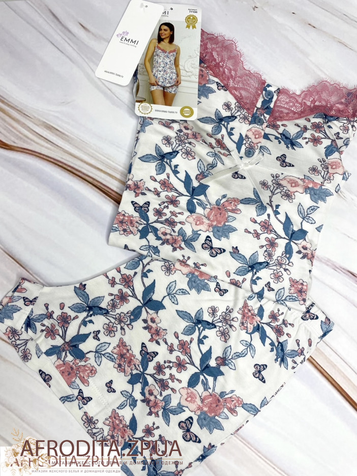 Жіночий домашній комплект Emmi 77106 з віскозного полотна. Комплект складається з майки на тонких бретельках, область декольте прикрашена ажурним мереживом та шортами.