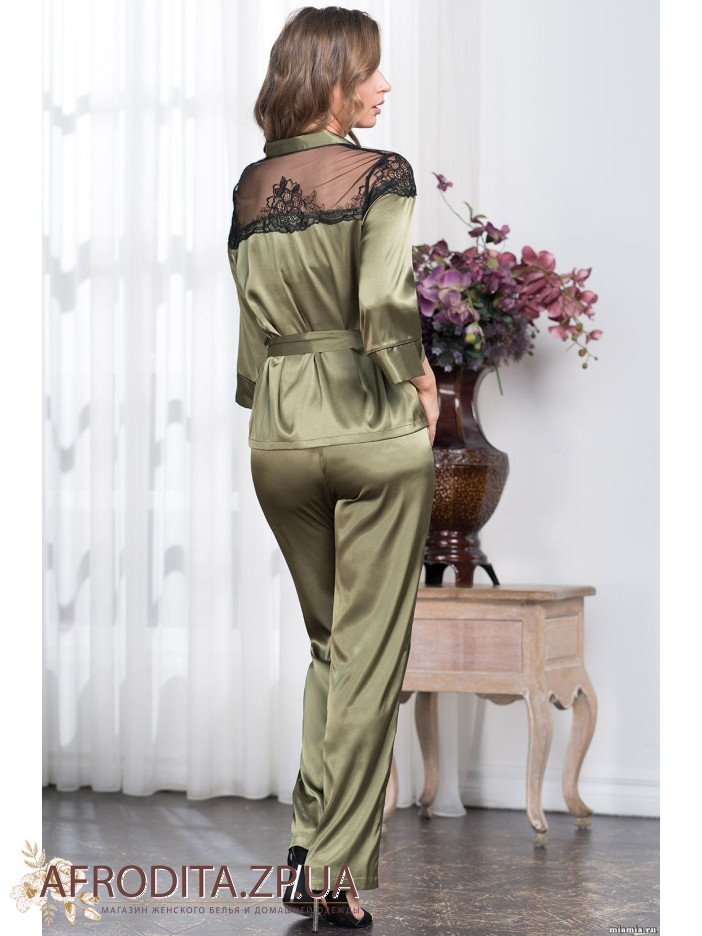 Елегантний комплект Mia-Amore з однотонного шовкового полотна, складається з жакету і штанів. Жакет вільного силуету з відкладним коміром, з рукавами ¾. Манжети та лінію борту прикрашають тонкі контрастні канти. Верх спинки та полички прикрашає мереживо. Пояс прикрашений декоративними пензликами. Штани виконані зі змішаного однотонного шовкового полотна, в бічних швах кишені. Бічні шви прикрашають тонкі контрастні канти.