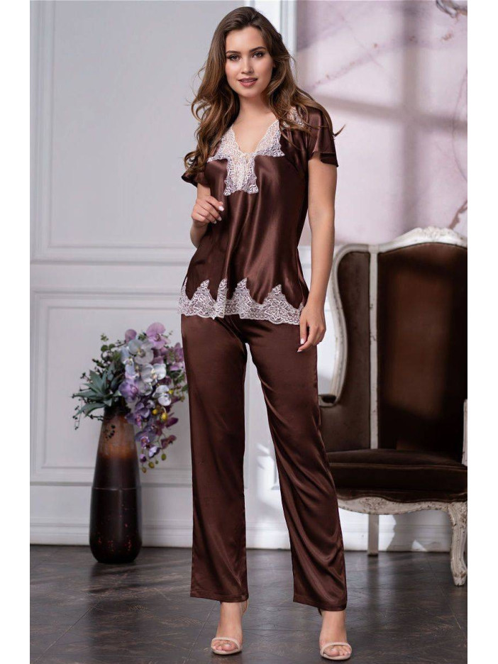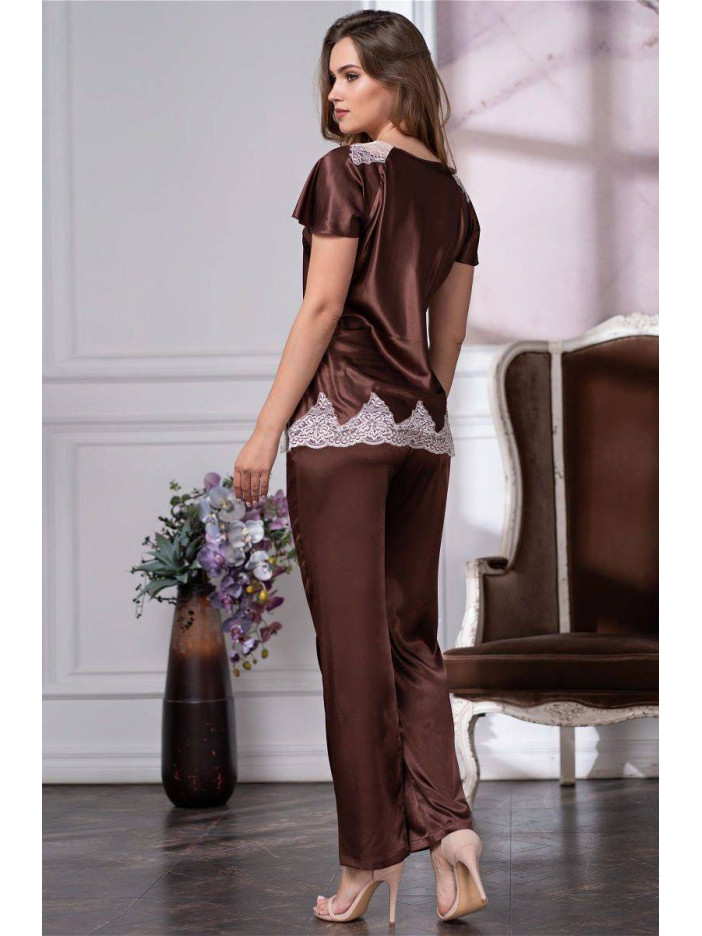 Комплект з брюками Mia Mia з смесового шовкового полотна. Ліф і низ блузи з короткими рукавами декоровані вишуканим мереживом, вирізана за формою мережива кромка тканини надає дивовижну легкість моделі. Дизайн колекції - студія Angelo Bellini (Milano).