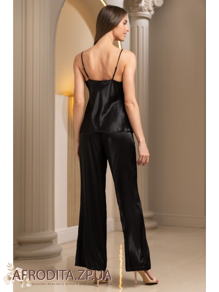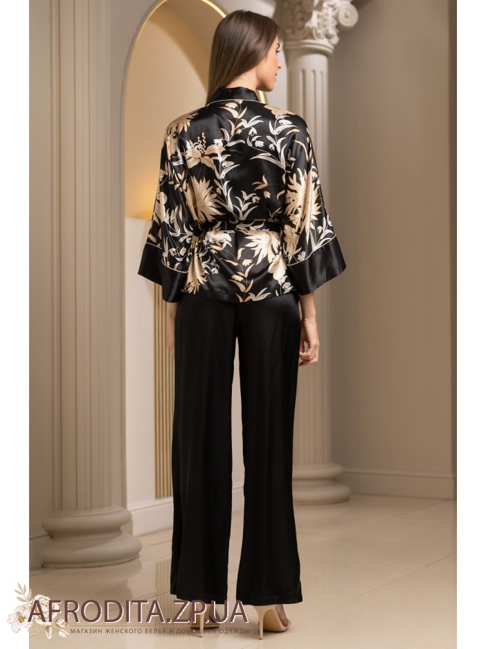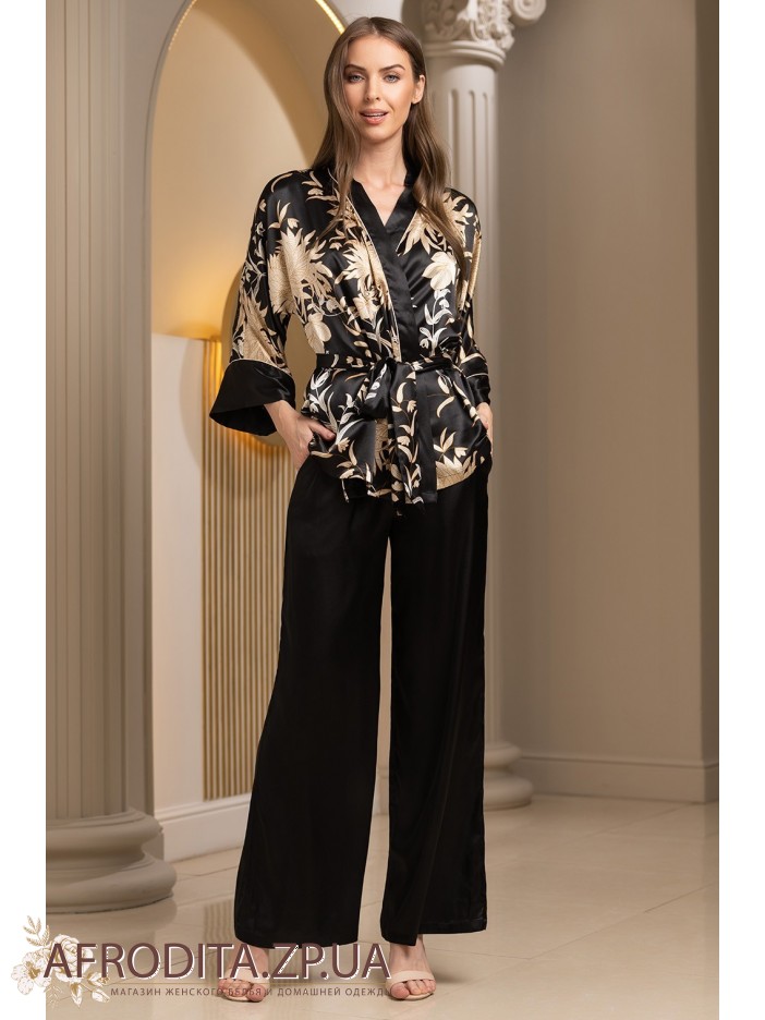 Брючний комплект-трійка Ельміра 4265 від Mia-Amore складається з жакета з довгим рукавом, топа на тонких бретелях та широких штанів. Комплект виконаний з натурального принтованого шовку з однотонною обробкою. Жакет і топ виконані з принтованого шовку з однотонною обробкою, а штани - з однотонного шовку. З боків штанів оброблені кишені. Лінію талії жакета можна підкреслити за рахунок поясу, що йде в комплекті.