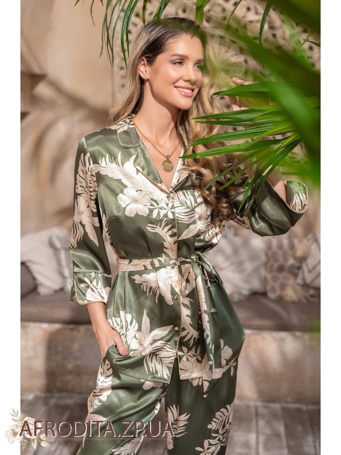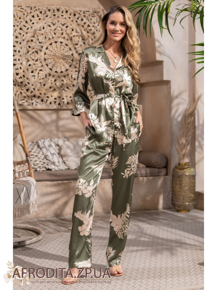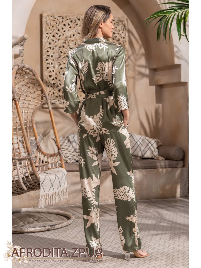 Брючний домашній комплект Лоренса 4245 від Mia-Amore з натурального принтованого шовкового полотна, складається з жакета з рукавами ¾ і штанів. Жакет на гудзиках, з накладною нагрудною кишенею. Відкладний комір і фігурні широкі манжети прикрашені тонкими кантами в колір малюнка. Штани довгі, з кишенями у бічних швах. Комплект доповнений поясом.