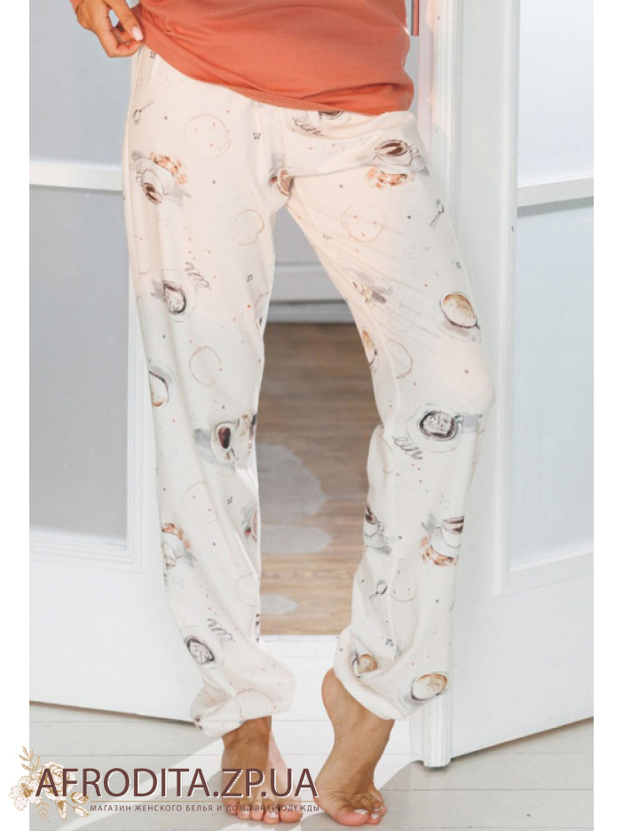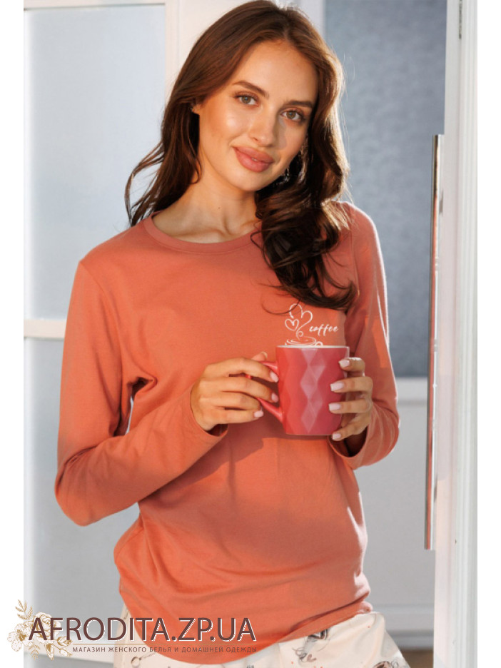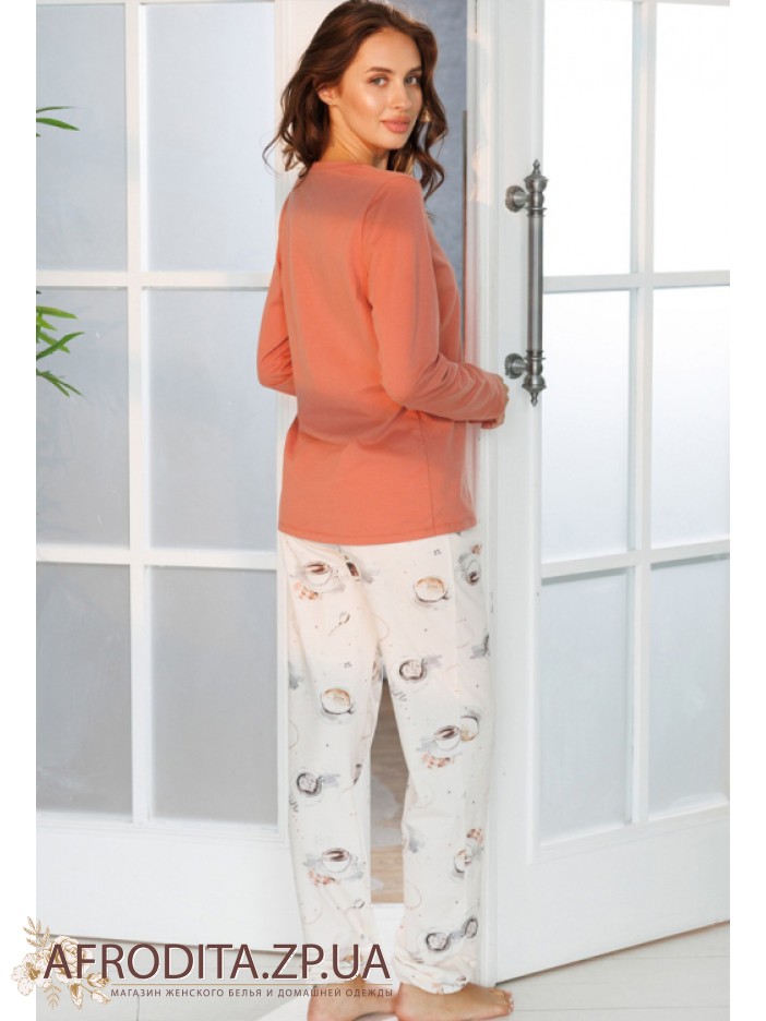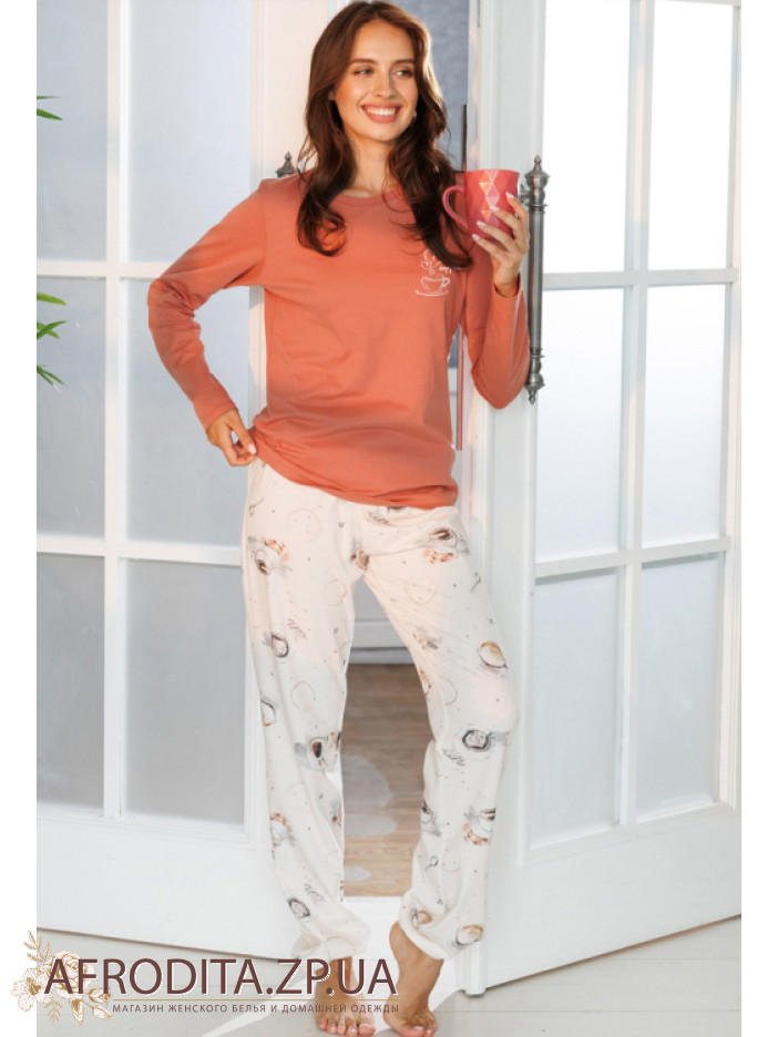 Домашній жіночий комплект 1297-16205 із м'якої бавовняної тканини. Модель складається із джемпера оранжевого кольору з довгими рукавами. Форма горловини має округлу форму. Штани прямого крою на резинці. Піжама дуже комфортна, а тканина приємна до тіла. Модель відмінно підійде як подарунок близьким вам людям.