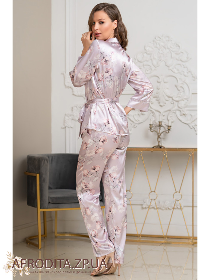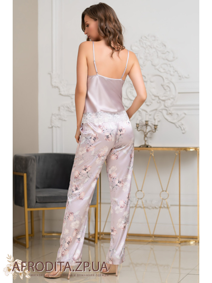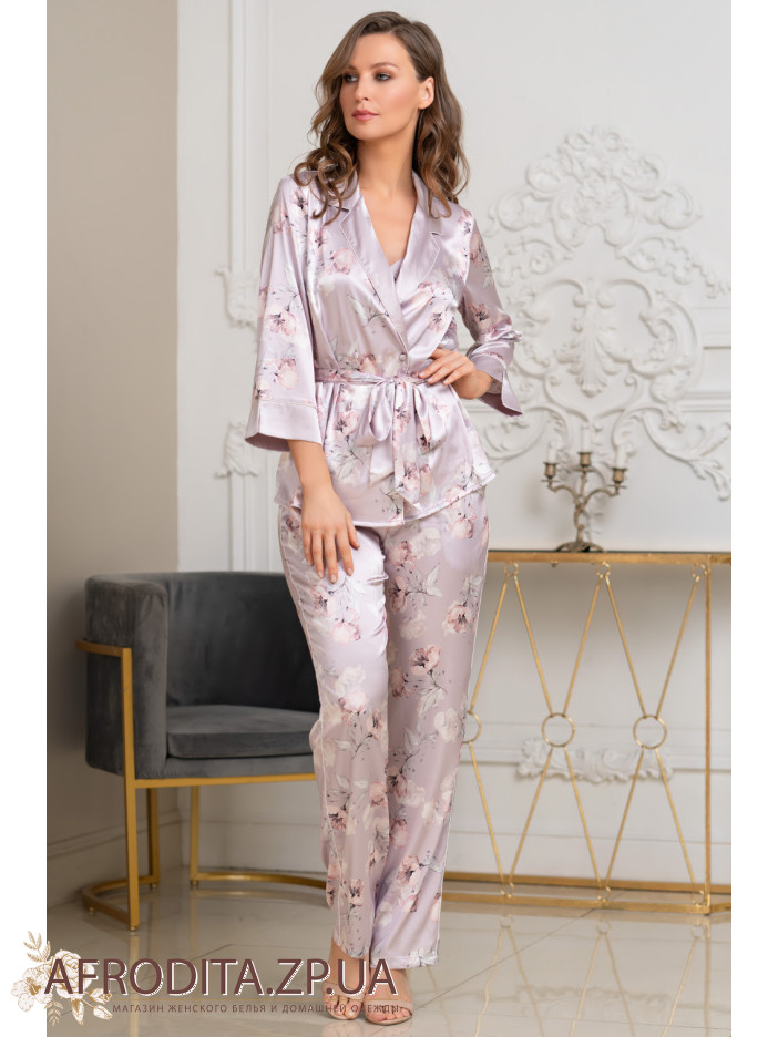 Комплект - трійка Селін 3718 від Mia-Amore складається з жакету, штанів та топу. Двобортний жакет з рукавом ¾ виконаний з принтованного шовку суміші і з однотонною обробкою по коміру і низу рукавів, контрастний кант проходить по межі двох видів матеріалів. Штани виконані з притуленого шовку з оздобленням у вигляді контрастного канта вздовж бічних швів, з боків оброблені кишені. Топ на тонких бретелях, виконаний з однотонного шовку з обробкою у вигляді контрастного канта по вирізу, низ оброблений мереживом. Лінію талії можна підкреслити за рахунок поясу, що йде у комплекті.