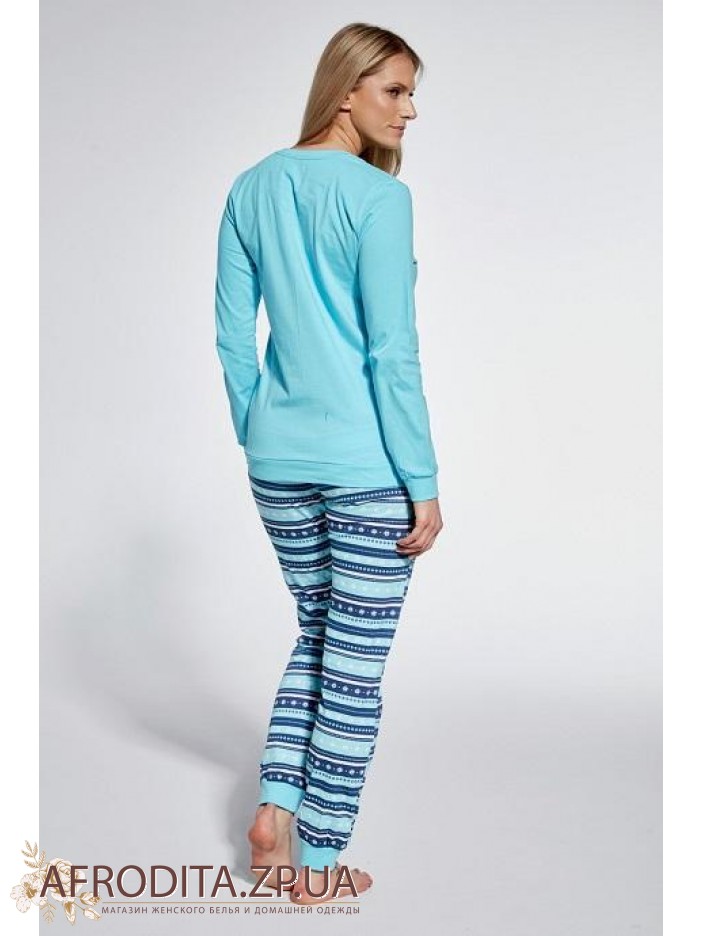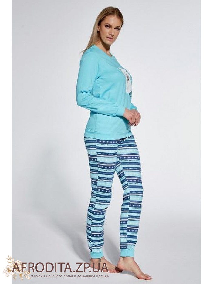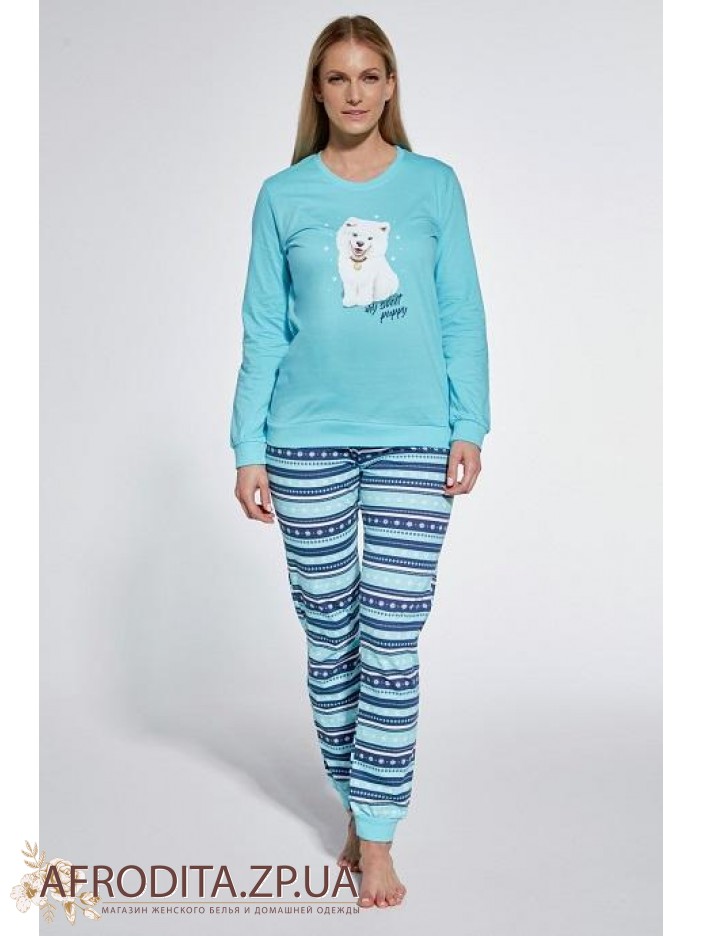 Жіноча піжама з брюками 345 Sweet Puppy з м'якої і приємної до тіла трикотажної тканини. У комплект входить джемпер з довгими рукавами ніжно-бірюзового кольору та штанів у смужку.