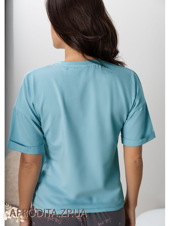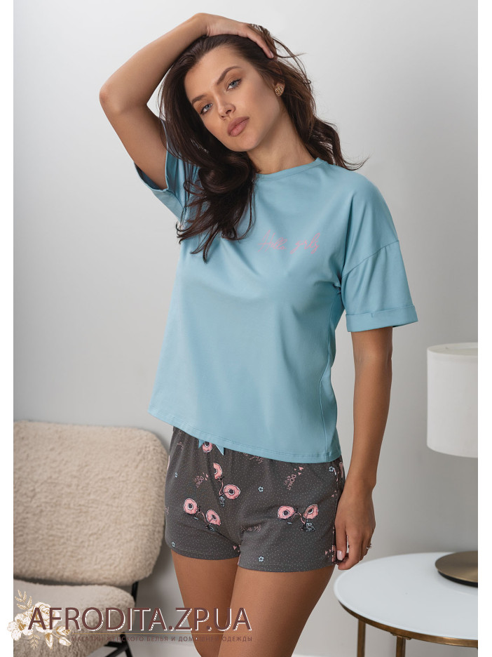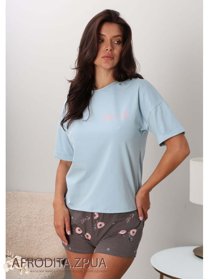 Жіноча піжама з шортами 1407-16019 з трикотажної тканини. Комплект складається з футболки ніжно-бірюзового кольору та коротких шортів сірого кольору з бантиком по центру.
