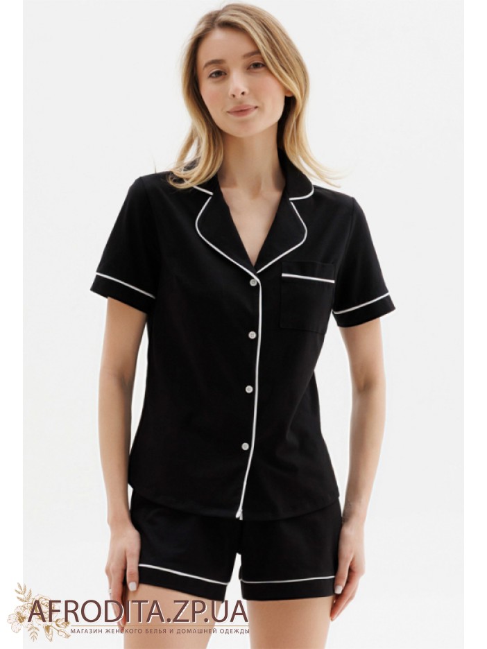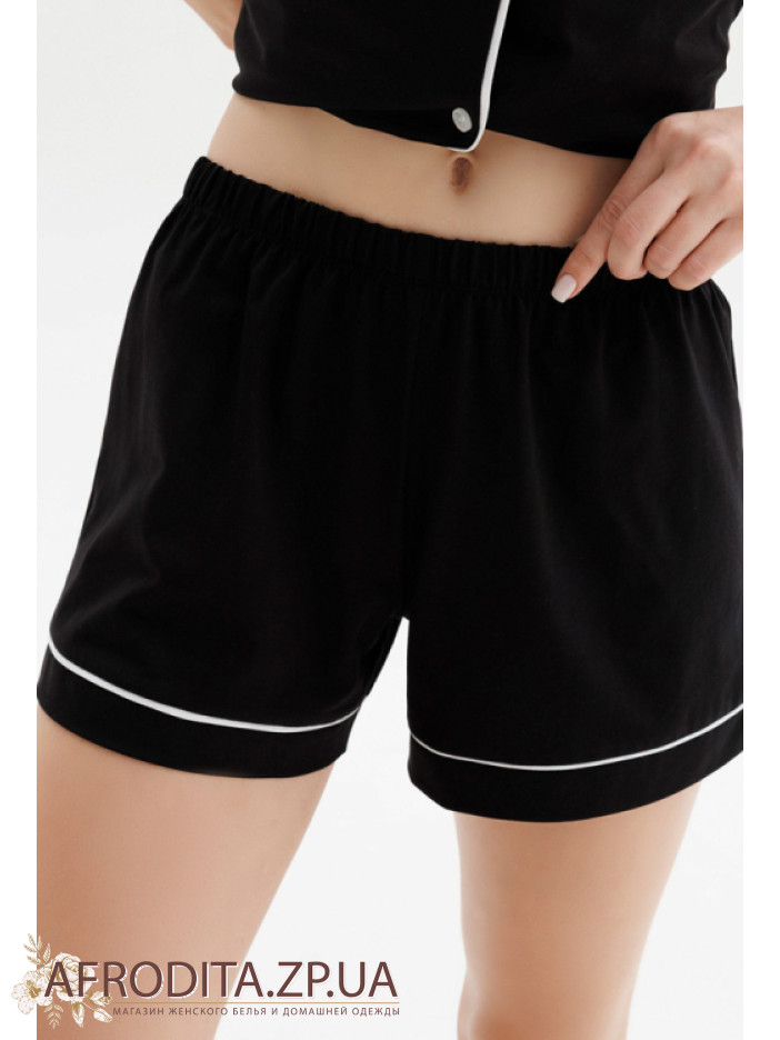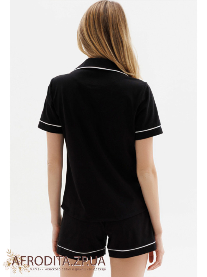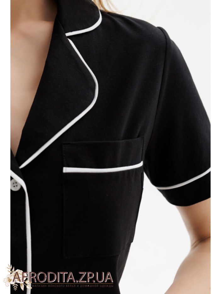 Жіноча піжама з шортами Roksana 1694-16002 виробництво Україна виготовлена ​​з трикотажної тканини на основі бавовни. У комплект входить сорочка чорного кольору із короткими рукавами, модель застібається на гудзики. Комір, накладна кишеня і рукави прикрашені білим контрастним кантом. Шорти вільного крою на гумці з білим кантом знизу.