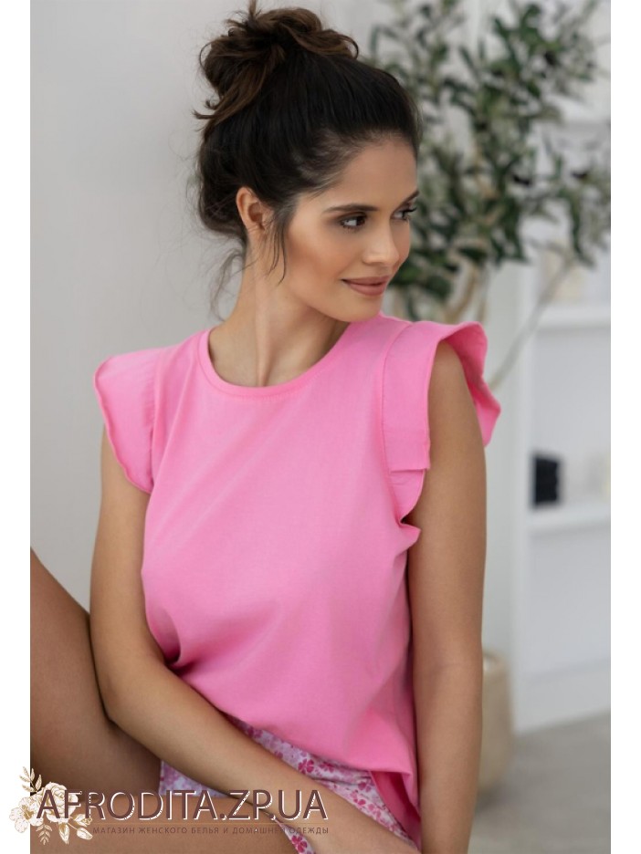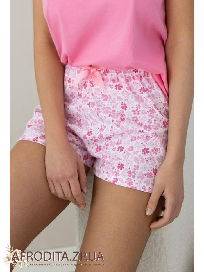 Жіноча піжама з шортами Sensis 82816 виготовлена з трикотажної тканини на основі бавовни. У комплект входить рожева майка прямого крою з короткими рукавами, горловина округлої форми. Шорти короткі на резинці з квітковим принтом, в поясі розташований атласний бантик в тон виробу.