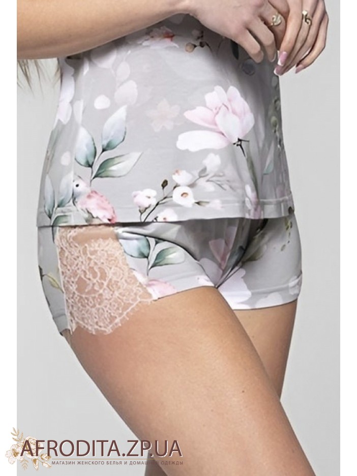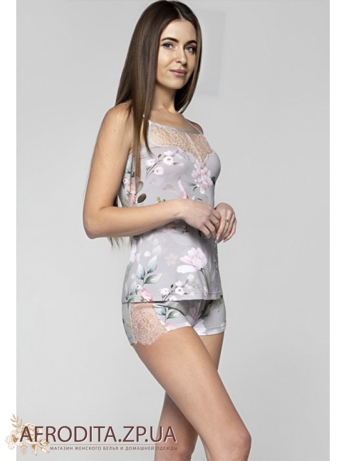 Жіноча піжама з шортами Shato 2222 з м'якої і дуже приємної до тіла віскози. У комплект входить майка на тонких бретелях регульованих, область декольте декорована мереживом, Шорти на гумці з бічними вставками з мережива.