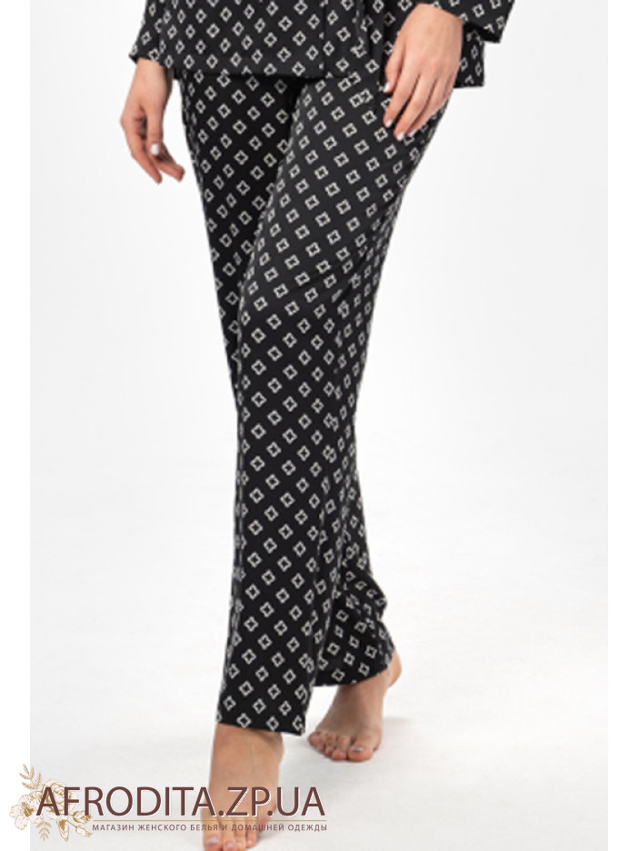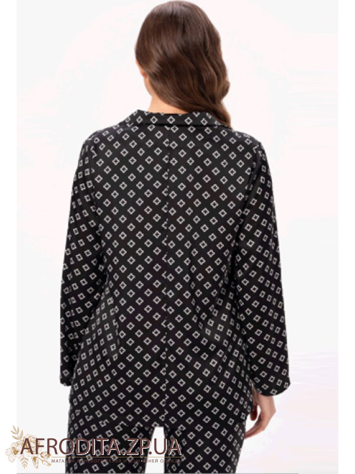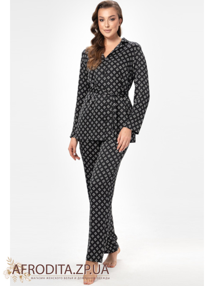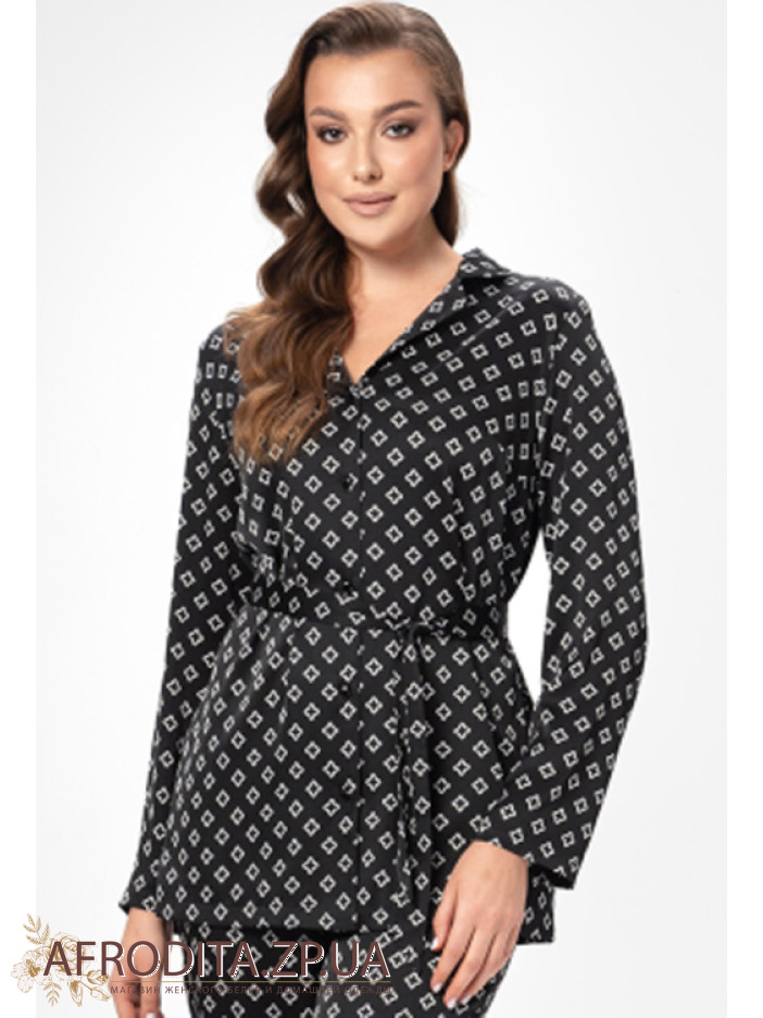 Вишукана жіноча піжама від українського бренду Shato – гармонія стилю, комфорту та жіночності. Модель виконана з м'якого і шовку Армані чорного кольору з витонченим білим орнаментом, який надає образу особливий шарм. Комплект складається з сорочки вільного крою та прямих штанів. Сорочка з довгими рукавами і класичним коміром застібається на гудзики, створюючи елегантний і акуратний силует. Штани з м'якою еластичною гумкою на талії забезпечують комфортну посадку та свободу рухів. Для виразнішого домашнього образу лінію талії можна підкреслити поясом, що входить у комплект. Піжама ідеально підійде для стильного відпочинку вдома і стане чудовим подарунком для коханої чи близької людини.