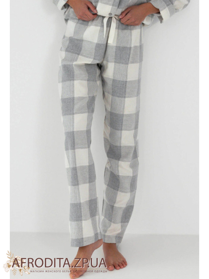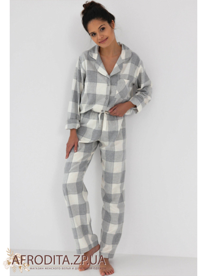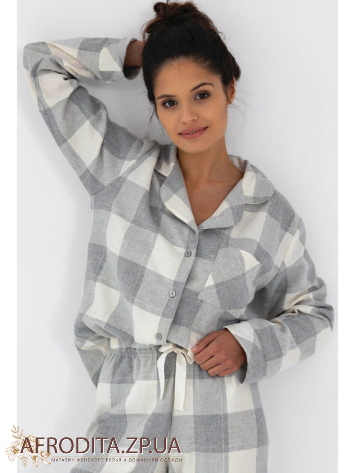 Жіноча піжама зі штанами Sensis Evie з фланелевої тканини. Комплект складається з сорочки на ґудзиках з довгими рукавами, на грудях розташована накладна кишеня, штани свобрдного крою на резинці з атласним бантиком.