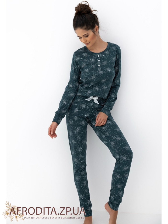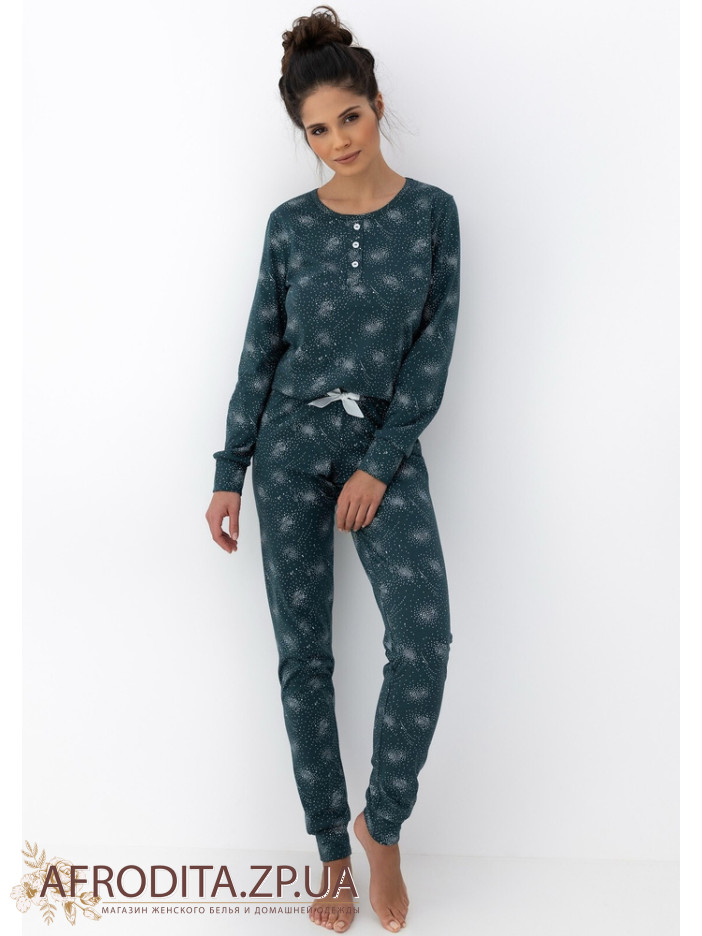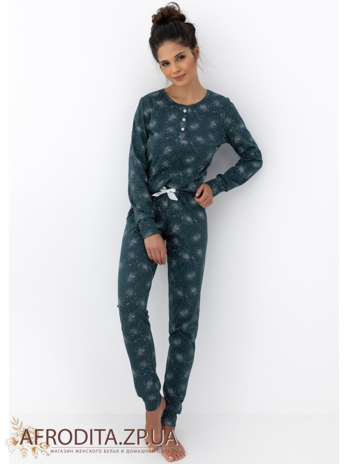 Жіноча піжама зі штанами Sensis 82660 з трикотажної тканини на основі бавовни. Модель складається з кофти з довгими рукавами, які оброблені манжетами, горловина має округлу форму. Область декольте декорована планкою з гудзиками. Штани трохи звужені до низу і також обграбовані манжетами, на поясі м'яка гумка та білим бантиком як декор. Комплект виглидить дуже стильно, м'яка тканина і дуже приємна до тіла.