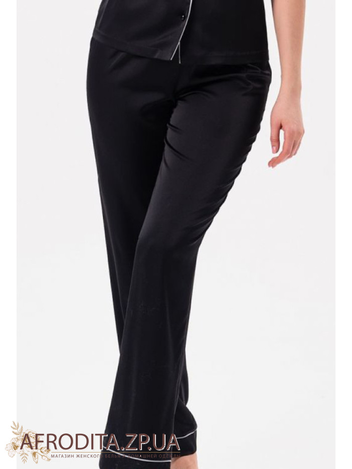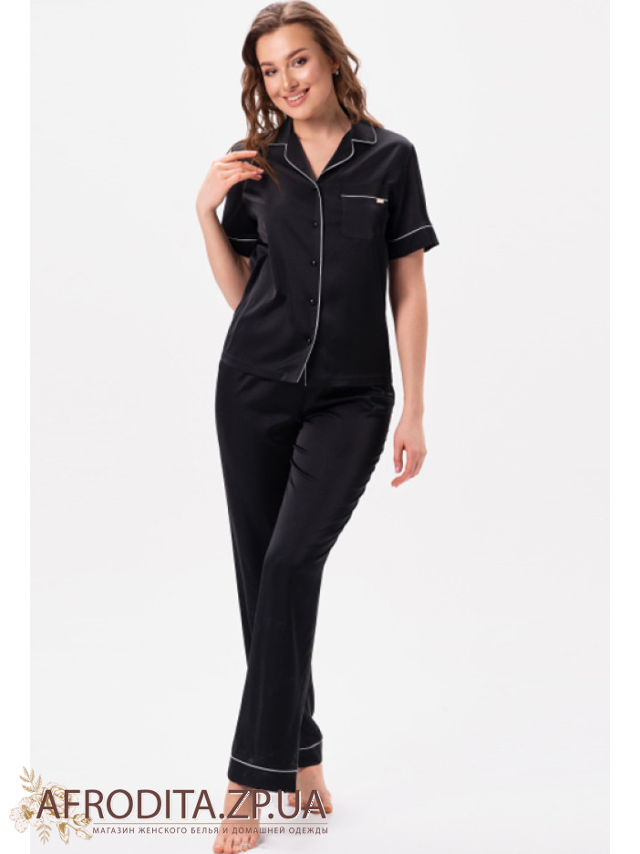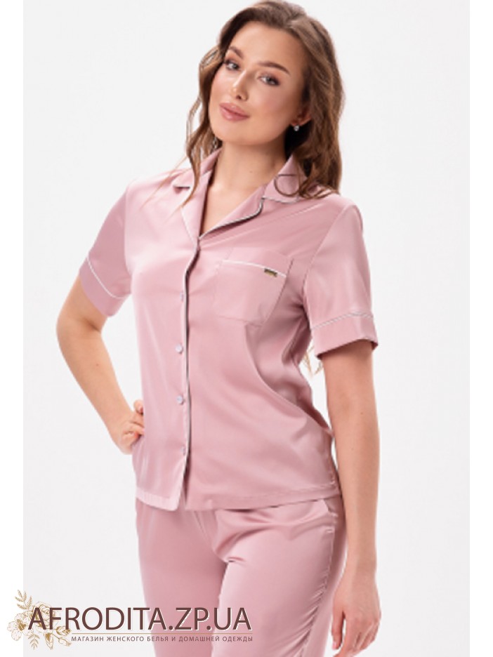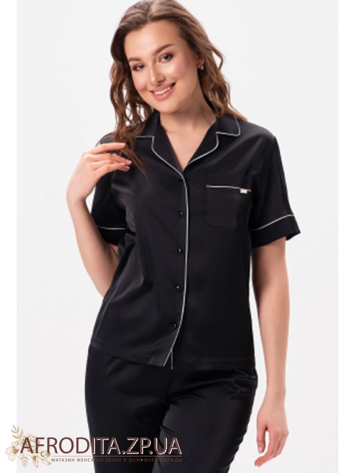 Жіноча піжама зі штанами 2613 з шовку Армані від української торгової марки Shato. Комплект складається з сорочки на ґудзиках вільного крою з короткими рукавами. З правого боку в області декольте розташована накладна кишеня, декорована білим кантом. Комір, рукави та полиця сорочки також прикрашена білим контрастним кантом. Штани прямого крою на резинці. Модель виглядає дуже елегантно та практично, може послужити гарною ідеєю для подарунка близьким вам людям.