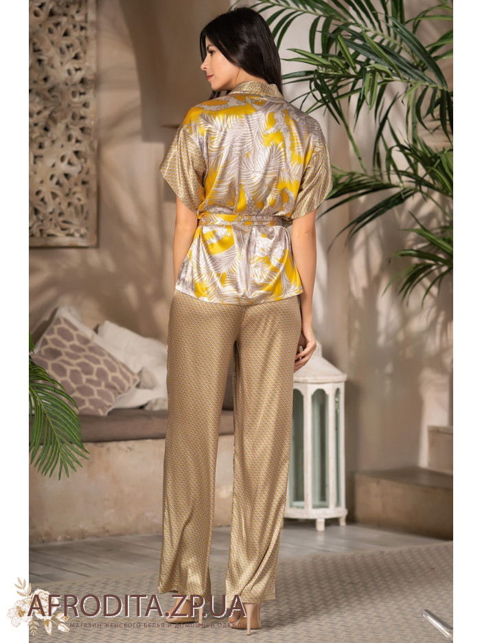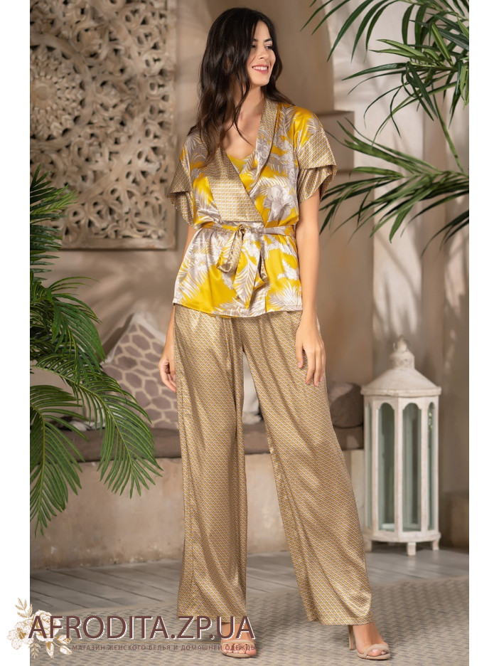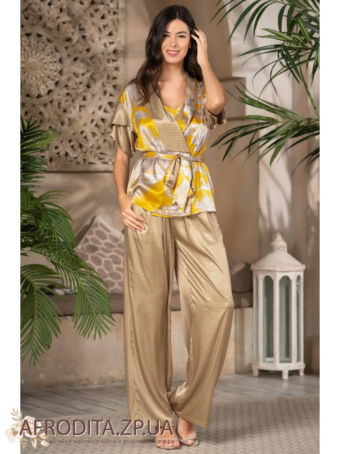 Комплект-трійка Амара 7228 від Mia-Amore складається із жакету з короткими рукавами, топа і штанів прямого силуету. Оригінальні рукави жакета виконані з принтованого дрібно візерунчастим геометричним патерном штучного шовку. Горловину жакета прикрашає асиметричний комір на кшталт шальки, виконаний також із поєднання двох принтів. Топ і штани відшиті з принтованого дрібно візерунчастим геометричним патерном штучного шовку.