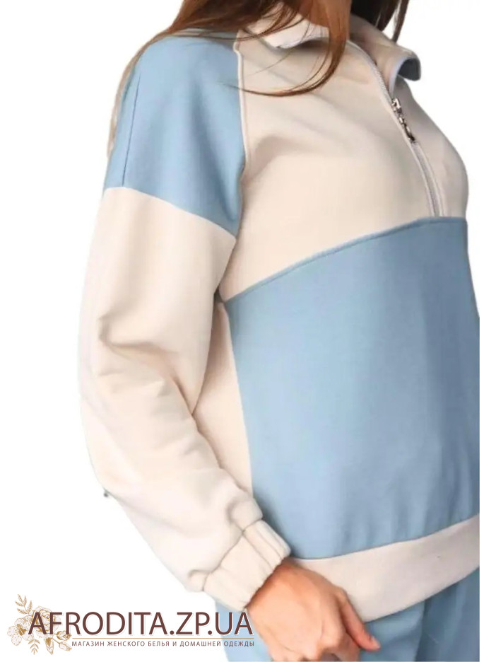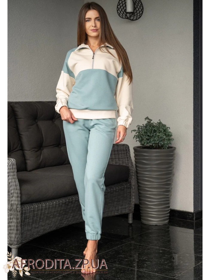 Жіночий теплий костюм Wiktoria 1426 з м'якої бавовни. До комплекту входить джемпер вільного крою з довгим рукавом, горловина застібається на блискавку. Рукавка з манжетами на гумці. Штани на гумці прямого крою,