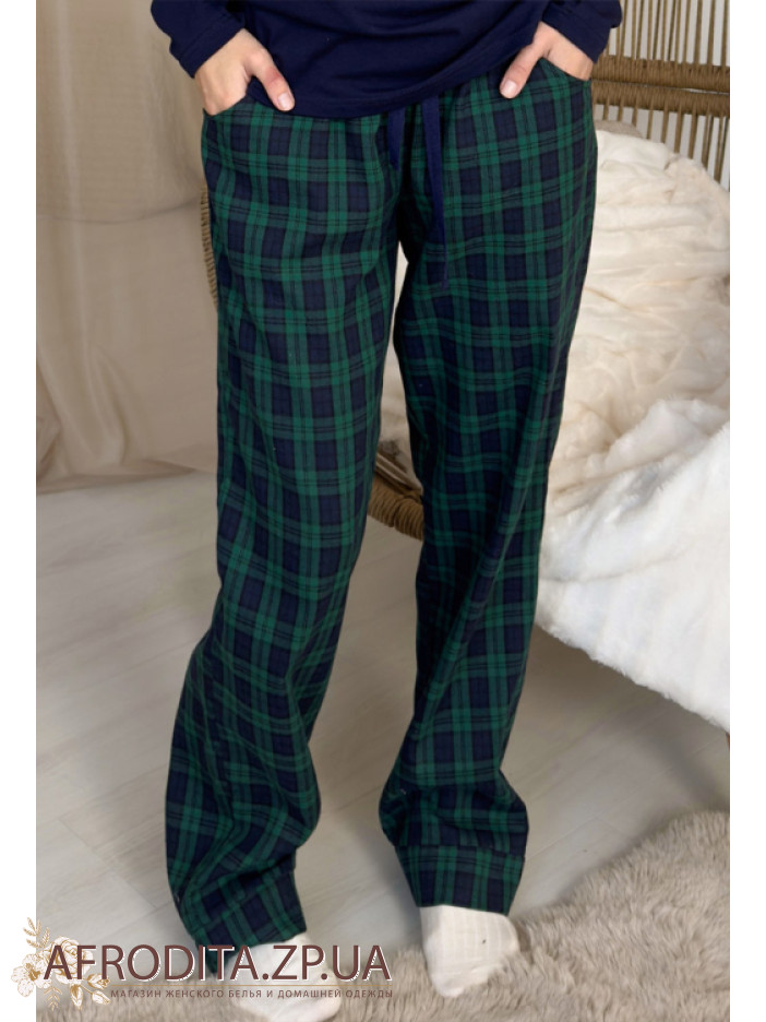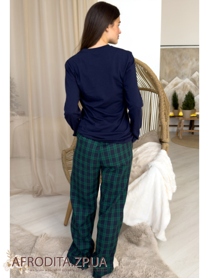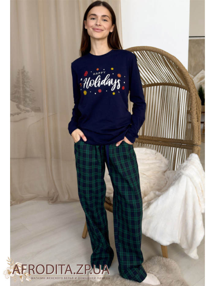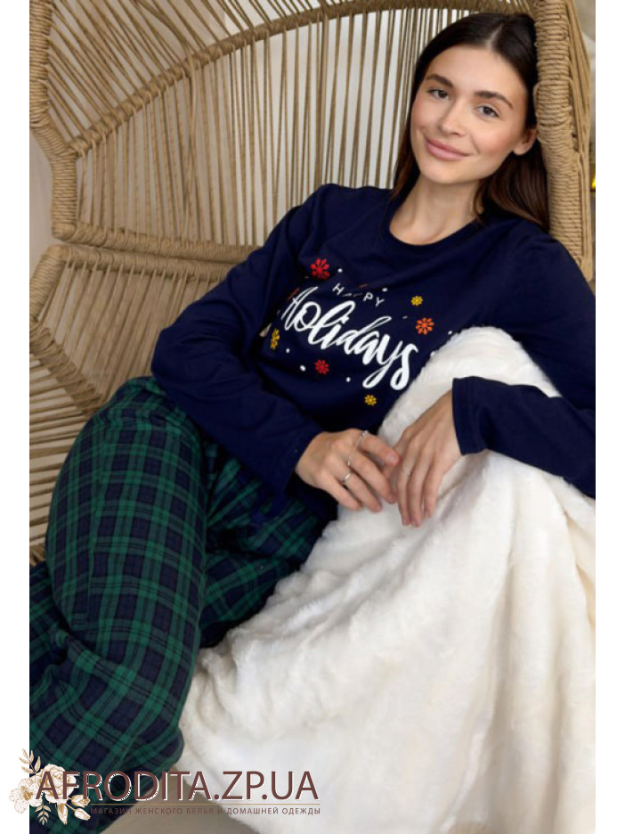 Жіноча піжама зі штанами виготовлена з м'якої фланелі на основі бавовни від українського бренду Cosy. У комплект входить однотонний джемпер вільного крою з довгими рукавами, на темно-синьому фоні нанесений напис "Happy Holidays". Штани вільного крою в принт, на поясі м'яка гумка з куліскою для регулювання лінії талії, з боків розташовані кишені.