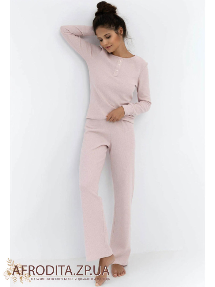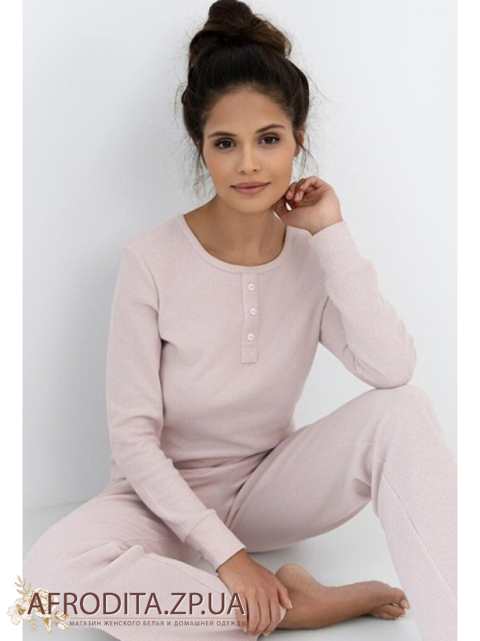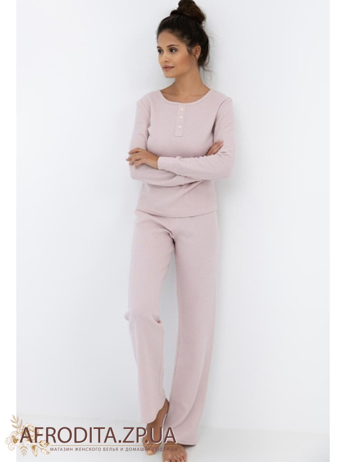 Жіноча піжама з брюками Sensis 82644 із трикотажного полотна на основі бавовни. Модель виготовлена ​​в пудровому кольорі і складається з кофти з довгими рукавами, горловина має округлу форму, в області декольте як декор розташована планка з гудзиками. Брьки дуже зручної посадки на гумці в області талії. Комплект дуже комфортний та практичний.