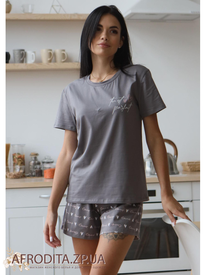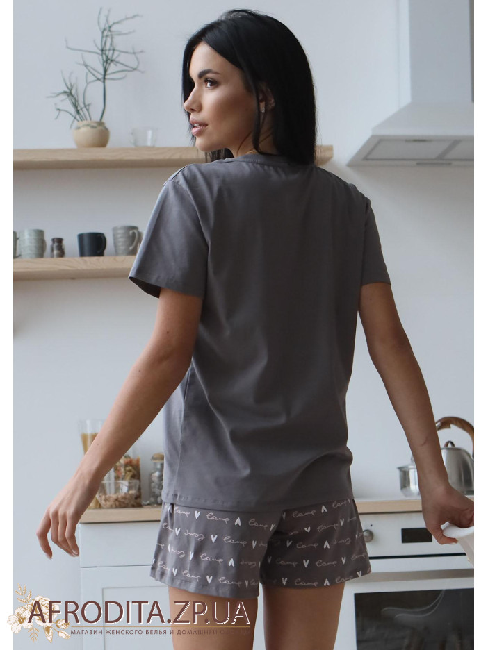 Жіноча піжама з шортами 1559-16049 із бавовни. Комплект складається з футболки з коротким рукавом сірого кольору та коротких шортів із принтом у вигляді сердець.