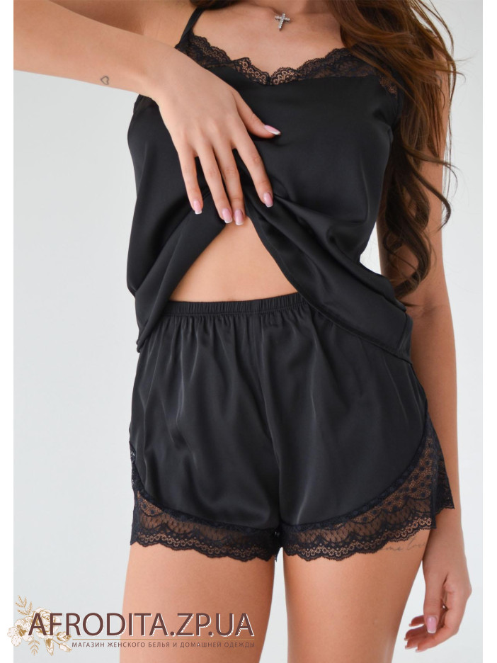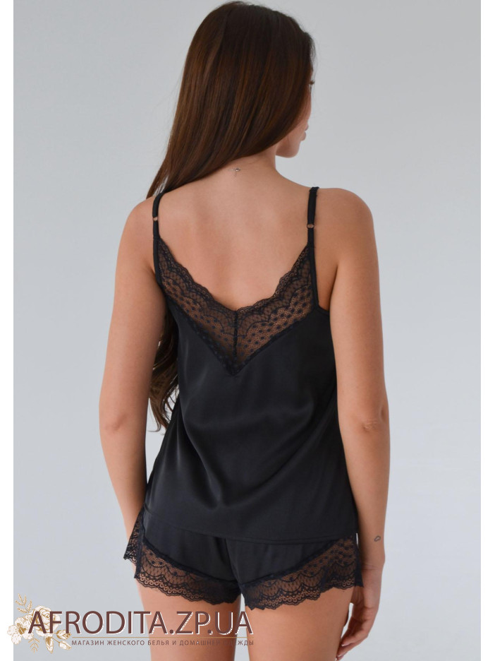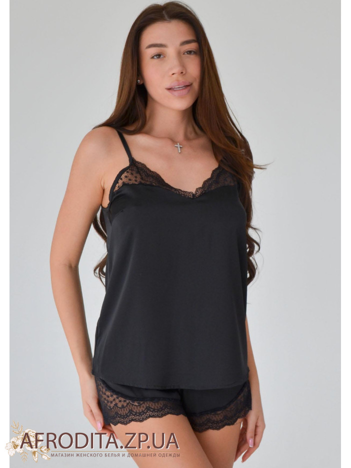 Жіноча піжама 1564-65025 із штучного шовку. Комплект складається з майки на тонких бретелях V-подібний виріз у ділянці декольте декорований мереживом, спинка ззаду також прикрашена мереживом. Шорти на гумці, краї декоровані мереживом.
