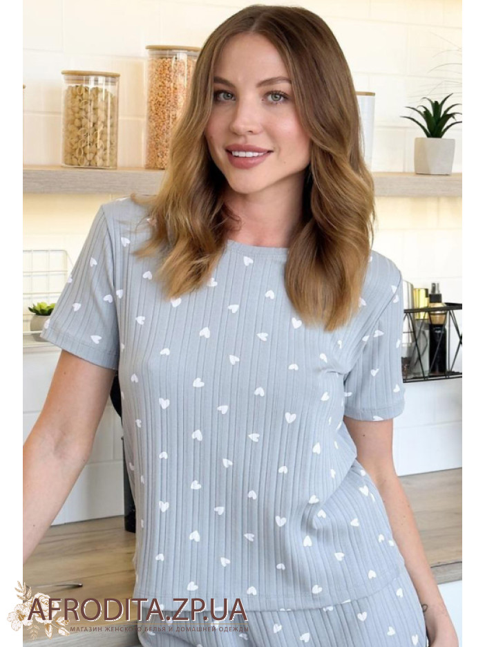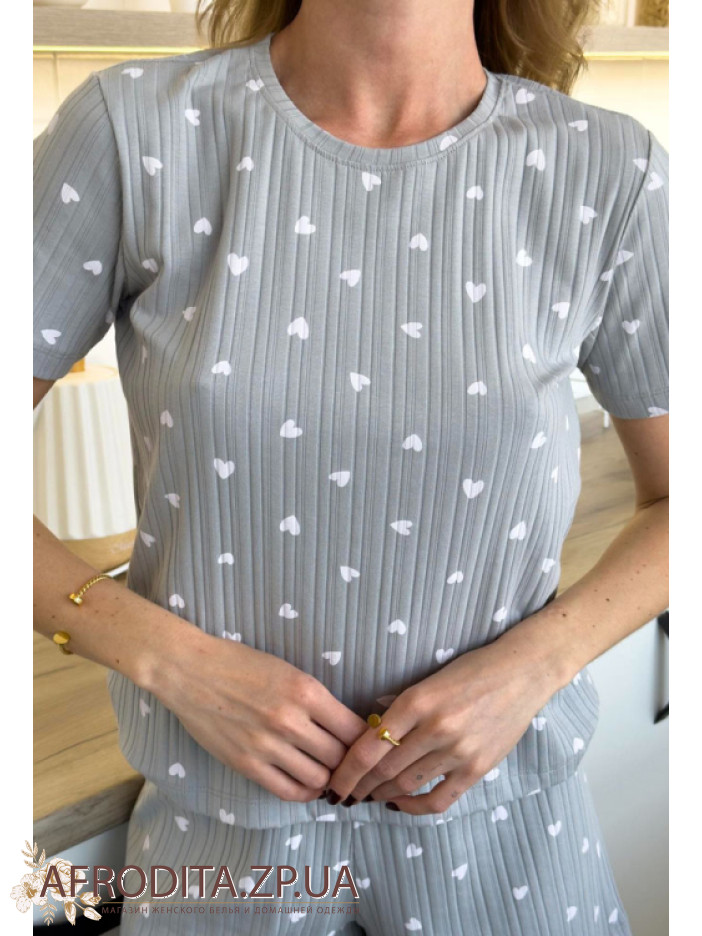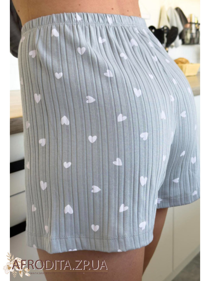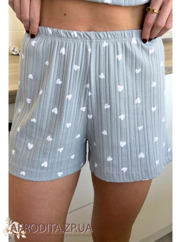 Жіноча піжама із шортами з бавовни GH02 від українського бренду Cosy. В комплект входить футболка та шорти сірого кольору з білими серцями, футболка з коротким рукавами про округлу форму горловини, шорти вільного крою на гумці. Піжама дуже м'яка і приємна до тіла і може бути чудовим подарунком для боїсної людини.