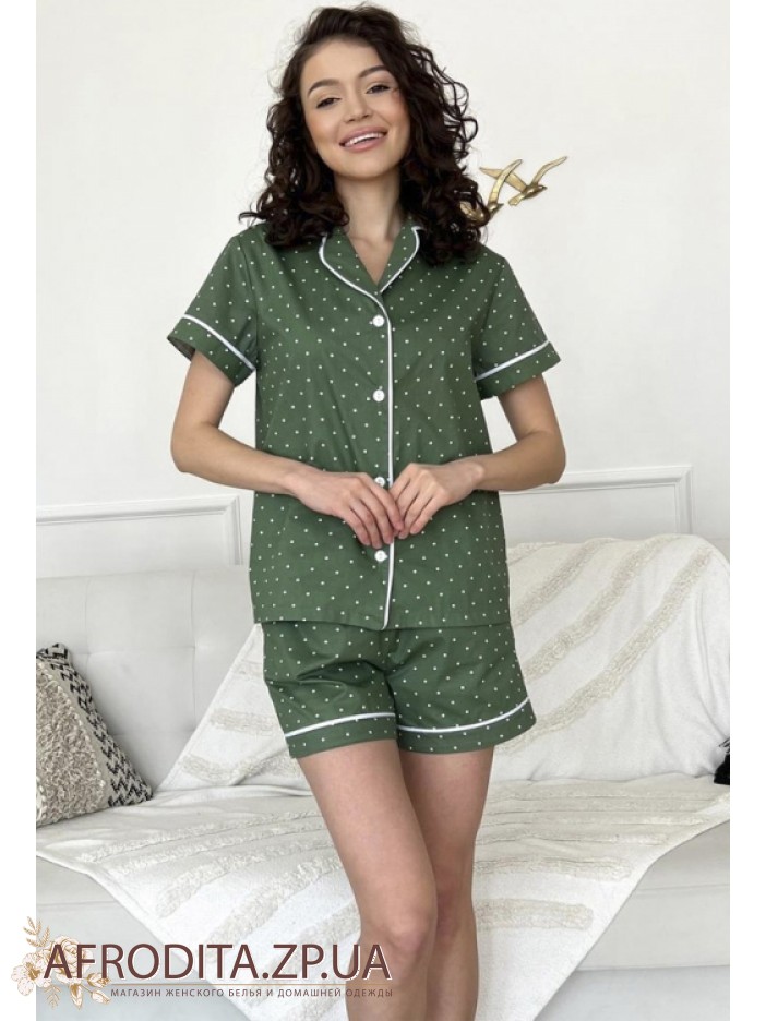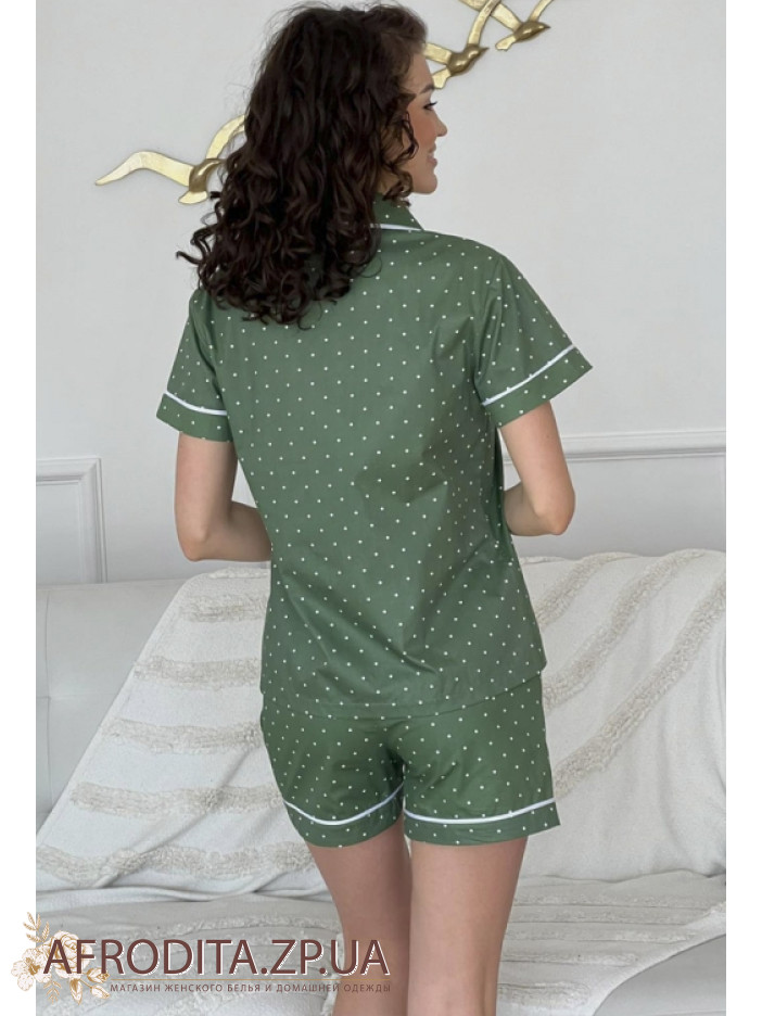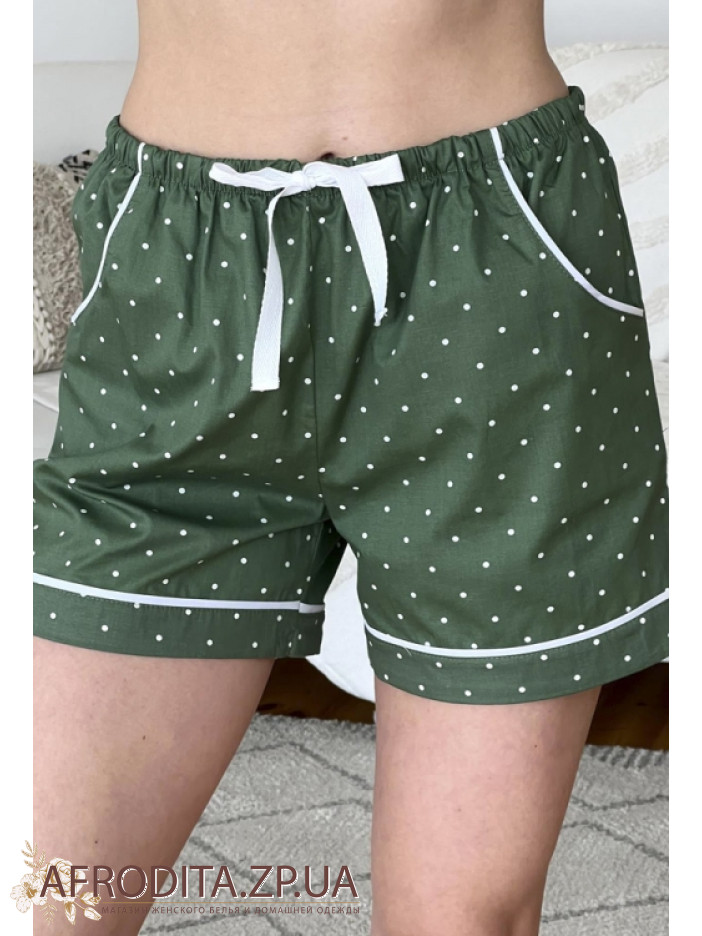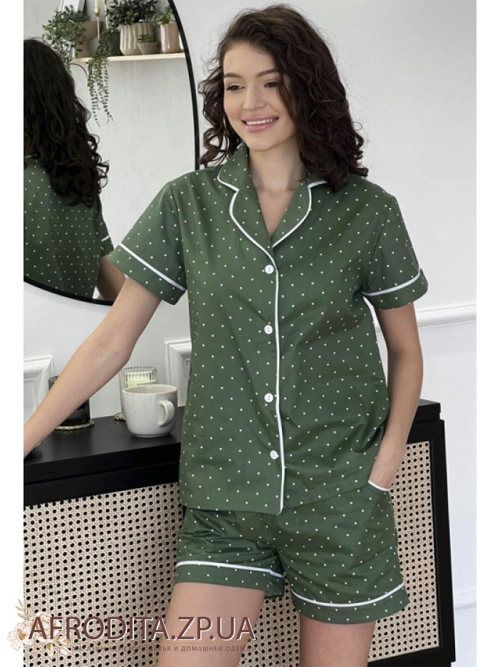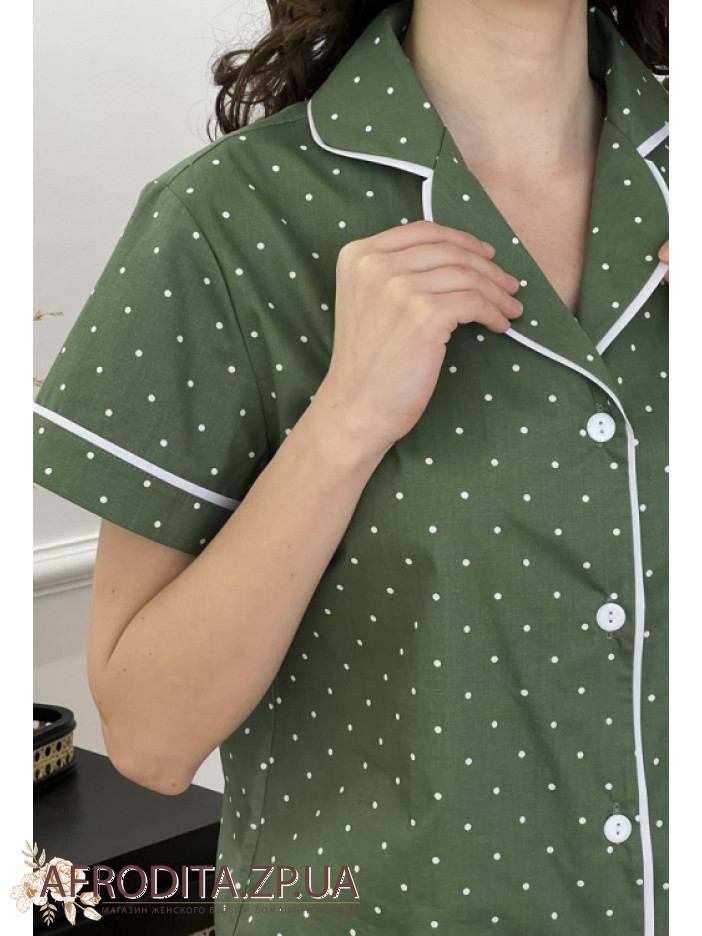 Жіноча піжама зі шортами торгової марки Cosy виготовлена ​​з трикотажного полотна на основі бавовни. Комплект оливкового кольору в білий горошок складається з сорочки на ґудзиках з короткими рукавами, Борт та рукави вироби декоровані білим контрастним кантом. Шорти вільного крою на резинці з кишенями, Талія можна регулювати за допомогою шнурка білого кольору. Піжама дуже комфортна і може стати хорошим подарунком близькій людині.