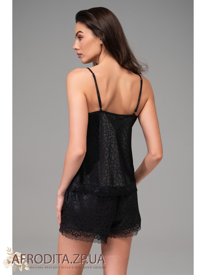 Жіноча піжама із шортами Джоанна 7312-1 від Mia-Amore із жаккардового шовку. Комплект складається з майки на тонких бретелях регульованих V-подібний виріз декольте а також низ майки прикрашений чорним французьким мереживом, по центру розташований бантик з кристалами Swarovski. Шорти на гумці з бічними кишенями, низ декорований мереживом кольору виробу.