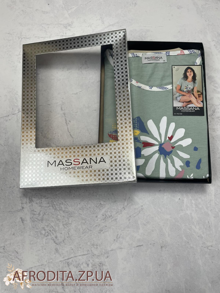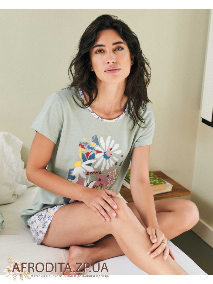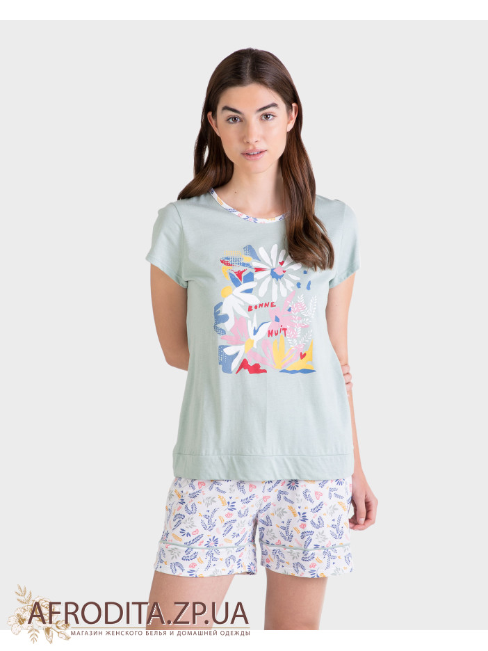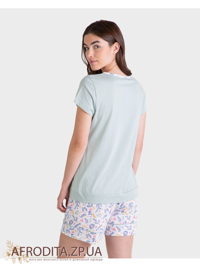 Жіноча піжама Massana P231209, що складається з футболки з короткими рукавами та контрастним круглим вирізом. Штани з принтом та регульованою талією.