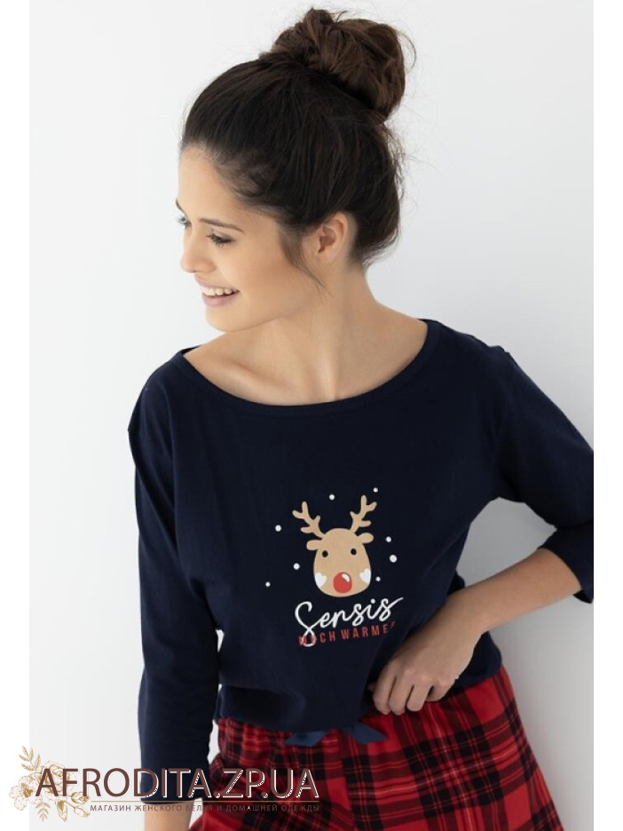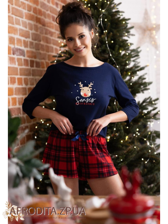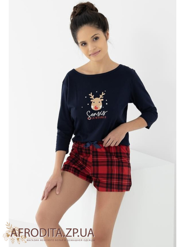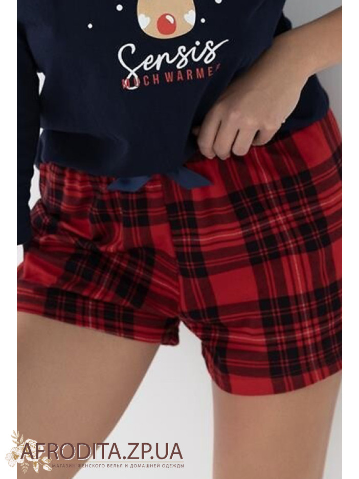 Жіноча піжама із шортами Sensis Myrtle виготовлена ​​з бавовни. Комплект складається з кофти темно-синього кольору із округлим вирізом горловини, довжина рукава 3/4. Шорти на резинці у шотландську клітку, по центру розташований бантик.
