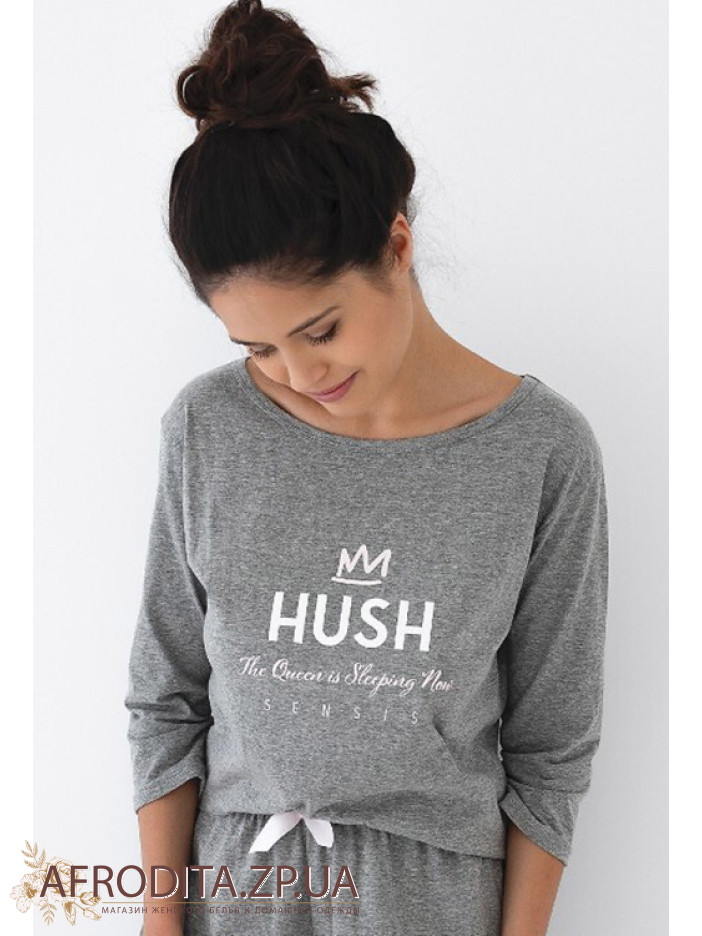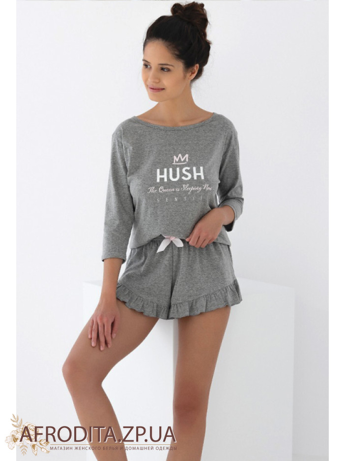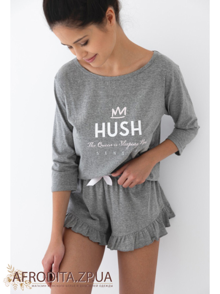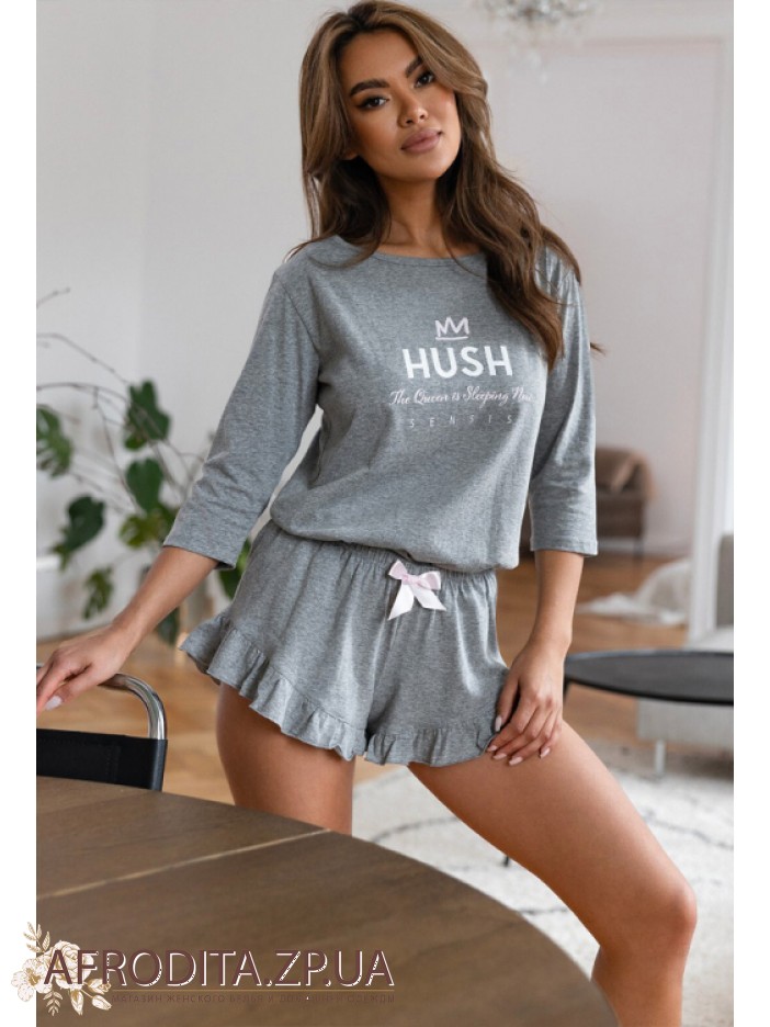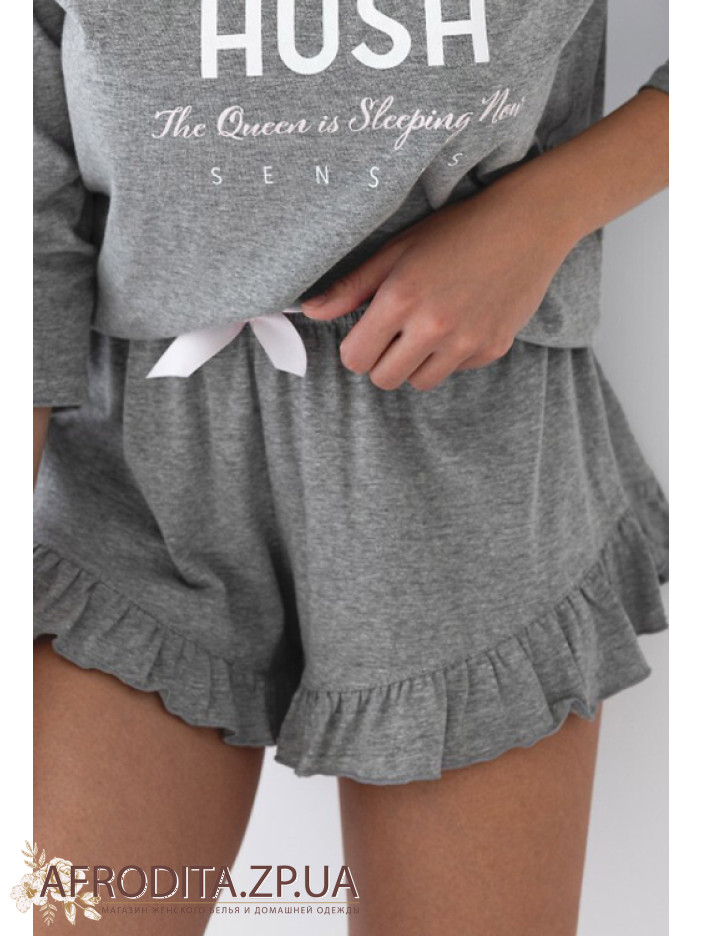 Стильна жіноча піжама із шортами Sensis Nancy виготовлена з м'якої та дуже приємної до тіла бавовни. У комплект входить з кофти сірого кольору з рукавом 3/4 і округлою горловиною та коротких шортів на гумці теж сірого кольору. Низ шорт декорований рюшами, по центру кокетливий бантик.