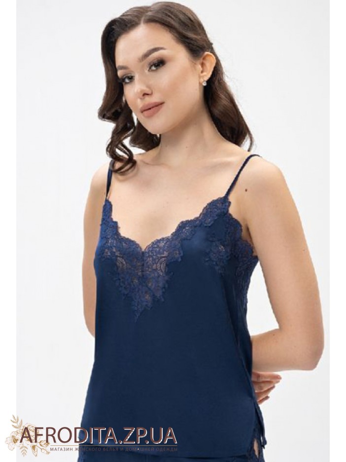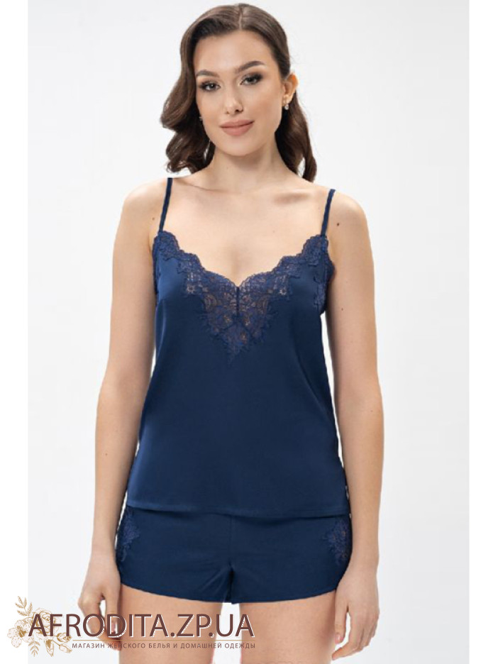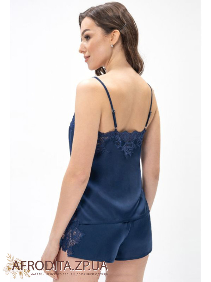Жіноча піжама із шортами Shato 2408 із атласного шовку. Комплект складається з майки на тонких бретелях, що регулюються. Область декольте та спинка прикрашені мереживом. Шорти на гумці з бічними розрізами, декоровані мереживом.