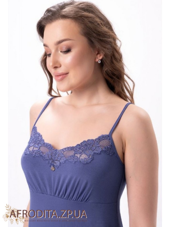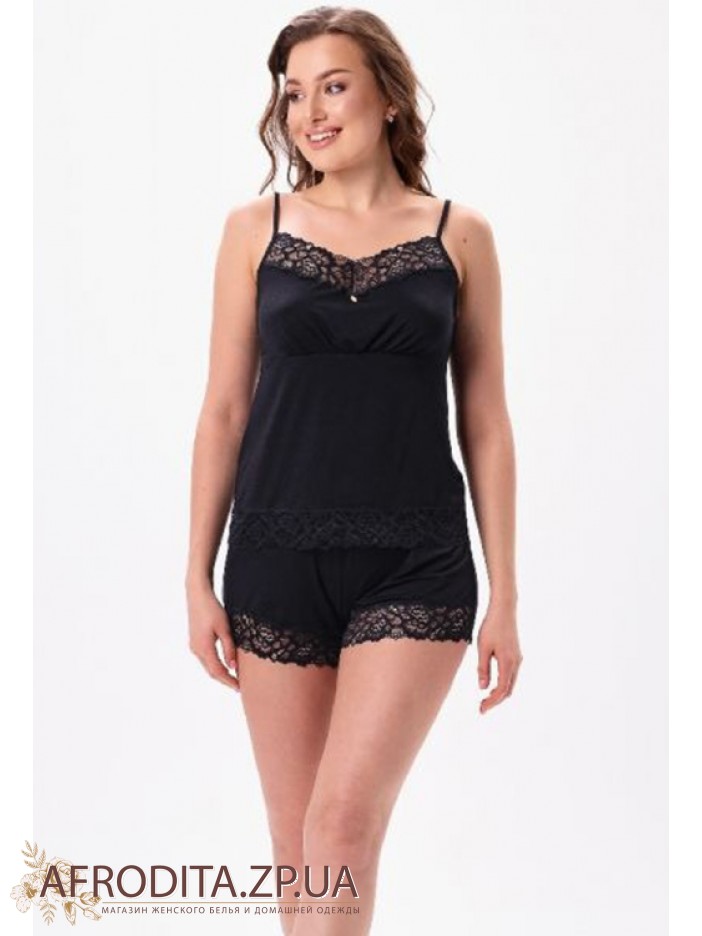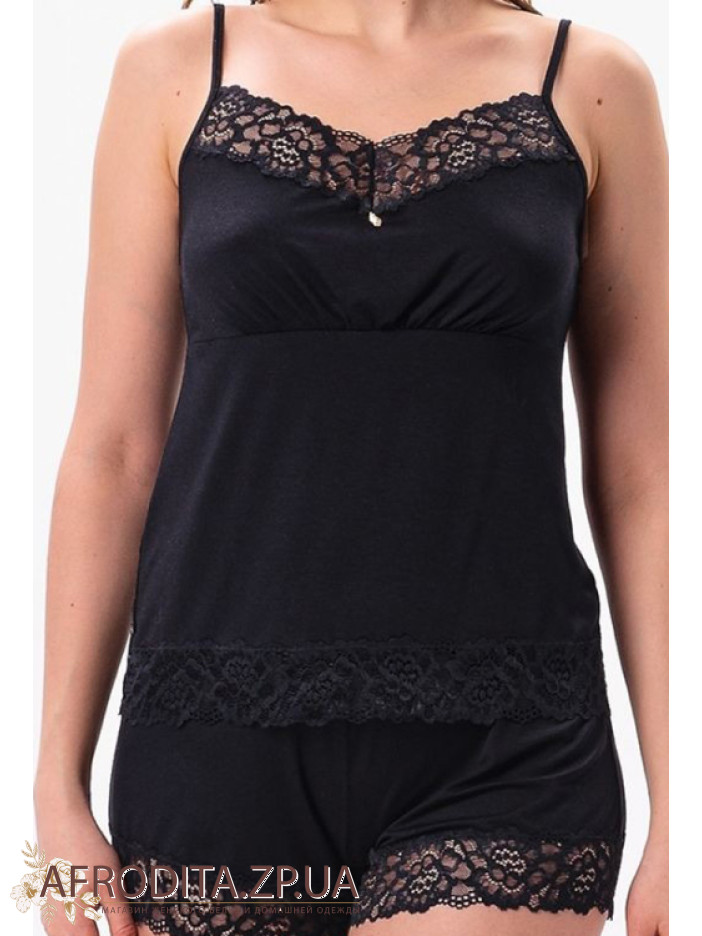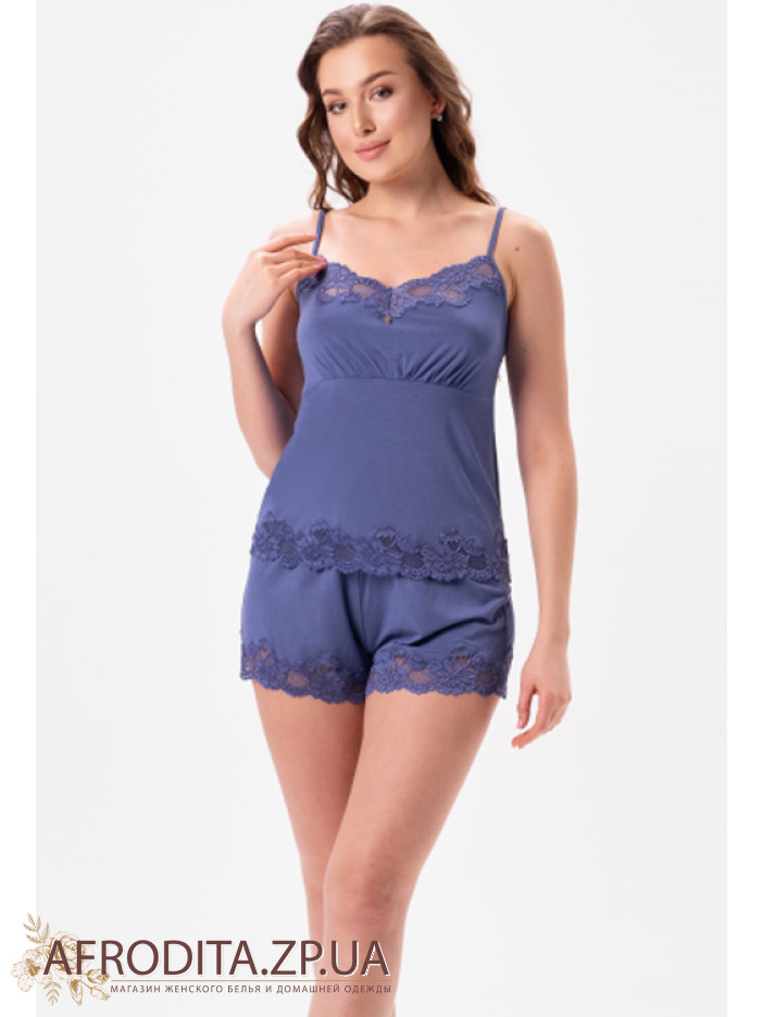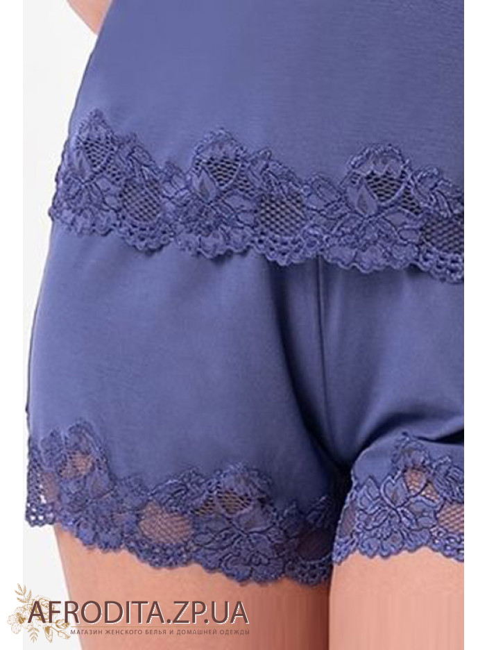 Жіноча піжама з шортами 2620 jeans від української торгової марки Shato виготовлена з м'якої віскози. Комплект складається з майки з підрізом під грудьми на тонких бретелях, що регулюються, V-подібний виріз декольте декорований тонким ажурним мереживом. Шорти на гумці, низ також прикрашений мереживом. Комплект виглядає дуже стильно і може бути чудовим подарунком близькій людині.