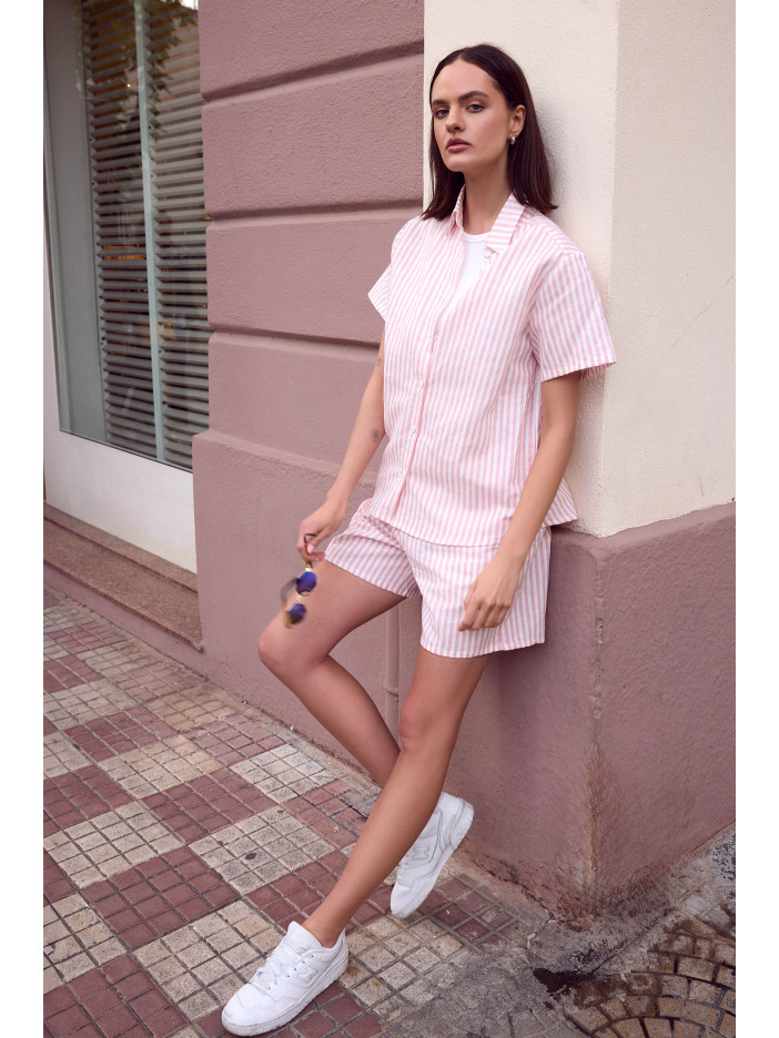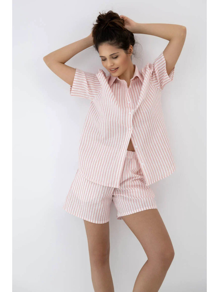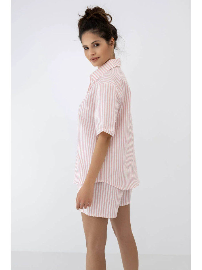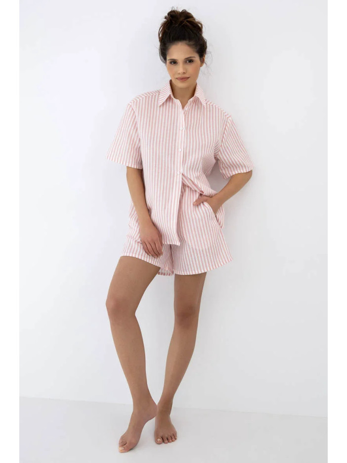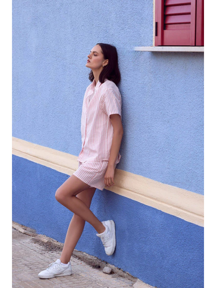 Сорочка з коротким рукавом, класичним комірцем і застібкою на ґудзики створює витончений і охайний силует, забезпечуючи легкість і зручність у носінні, а короткі шорти з еластичним поясом, обшитим м’якою тканиною, ніжно прилягають до тіла без тиску, даруючи максимальний комфорт протягом усього дня; практичні кишені додають функціональності, перетворюючи комплект не лише на стильну піжаму, а й на ідеальний варіант літнього домашнього одягу; ця модель стане чудовим вибором для жінок, які цінують елегантну класику, натуральні тканини та свободу рухів, адже поєднання льону та бавовни забезпечує приємні відчуття навіть у спекотні дні; вільний крій гарантує комфортну посадку, а якщо вагаєтесь між розмірами — оберіть більший для ще більшої зручності; легкий догляд (прання при 30°C у делікатному режимі та природне сушіння) дозволить зберегти бездоганний вигляд надовго; Selene Sensis — це гармонія стилю, якості та затишку для ваших ідеальних літніх вечорів;