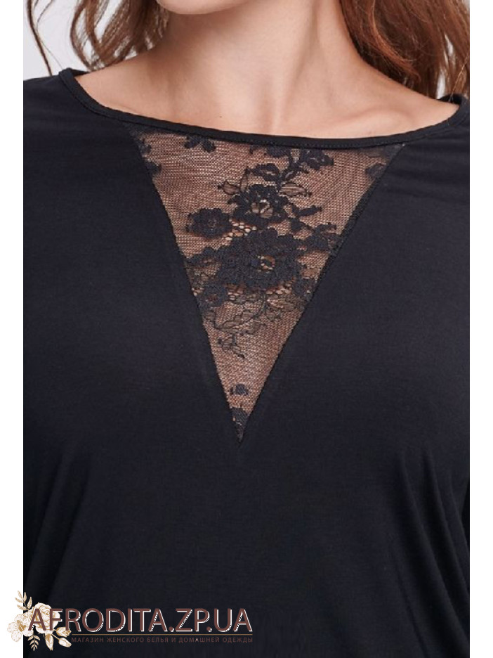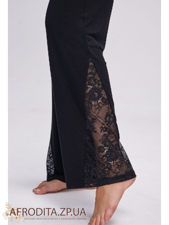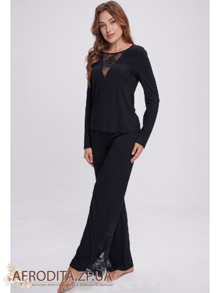 Жіноча піжама Shato – стильний та комфортний варіант для сну та домашнього відпочинку. Виконана з м'якої віскози чорного кольору, що приємна до тіла. Кофта з довгими рукавами прикрашена витонченою мереживною V-подібною вставкою, штани прямого крою з м'якою гумкою доповнені мереживними деталями по низу. Затишна, елегантна та ідеальна як подарунок.