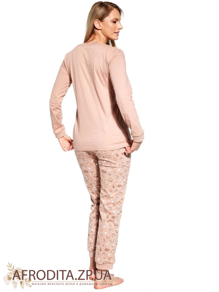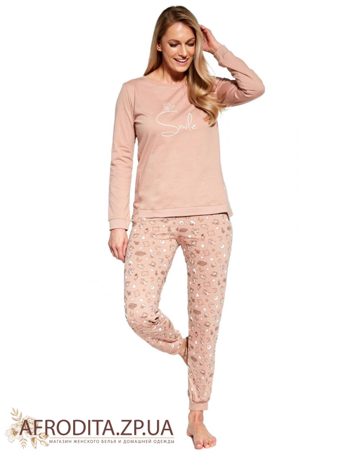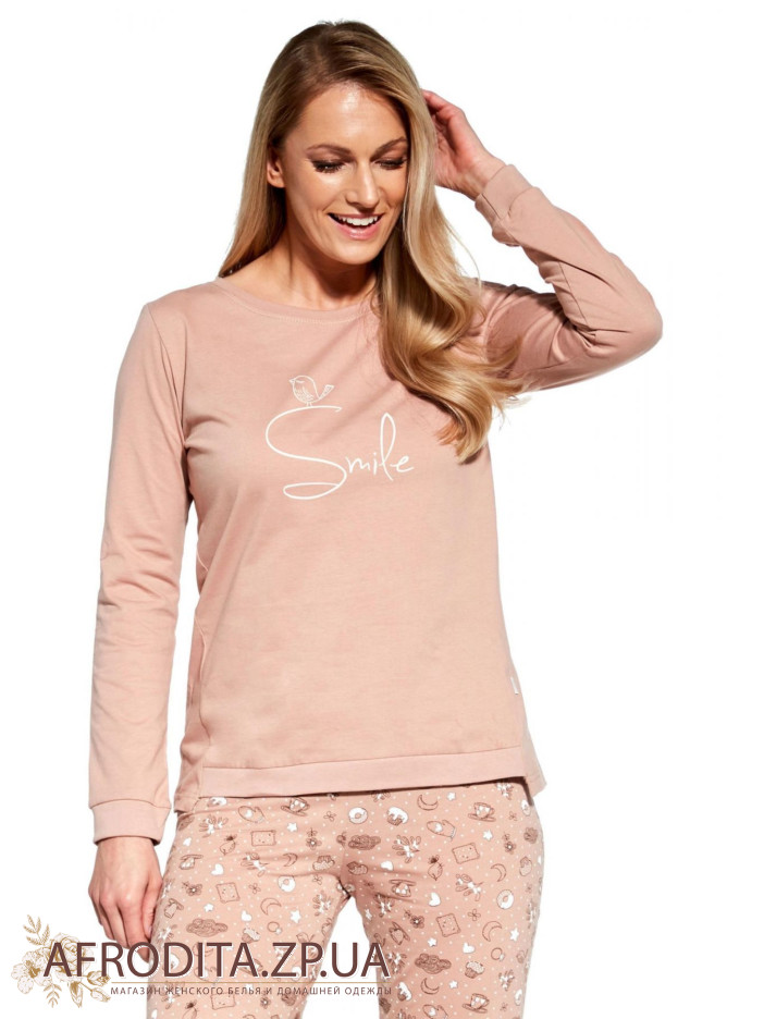 Жіноча піжама зі штанами 160-23 з бавовни у бежевому кольорі. Комплект складається з однотонного джемпера з довгими рукавами з написом Smile та штанів на резинці.