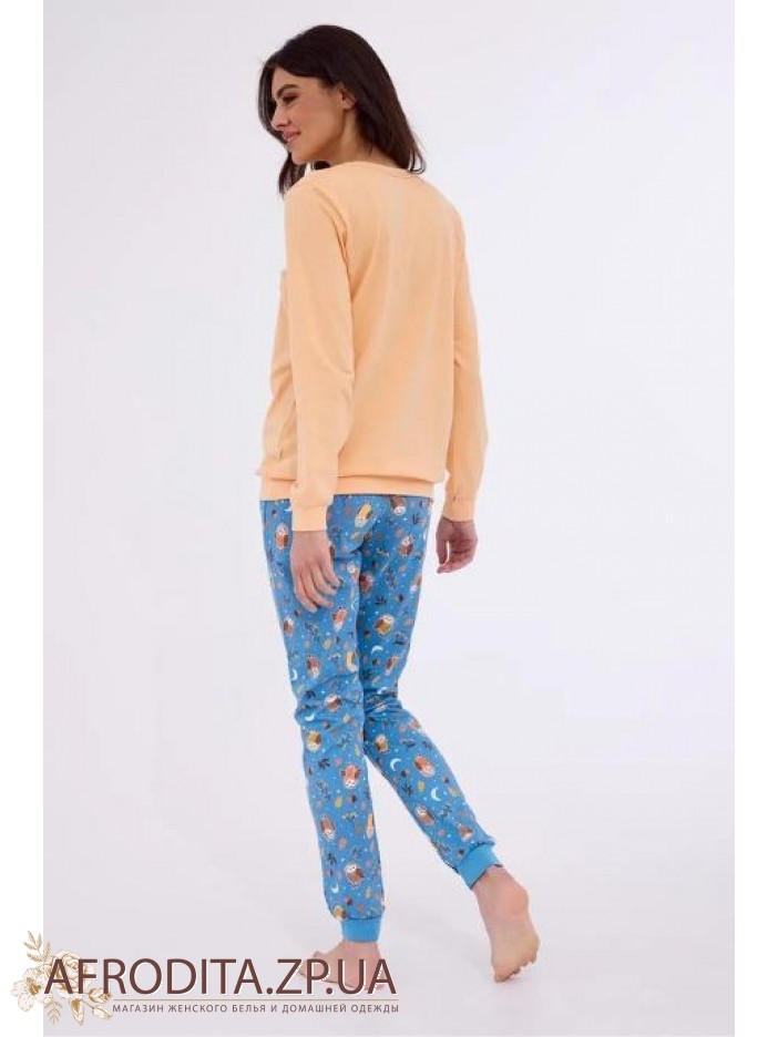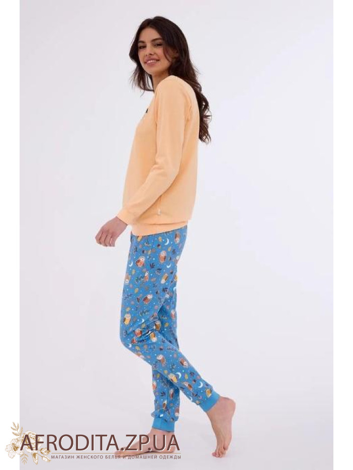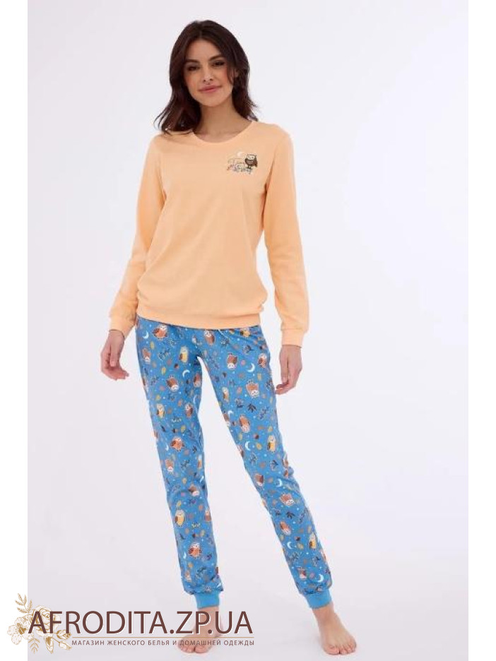 Жіноча піжама зі штанами 467-373 B24 виготовлена з високоякісного трикотажного полотна. Комплект складається з джемпера персикового кольору з довгими рукавами та блакитних штанів на резинці.