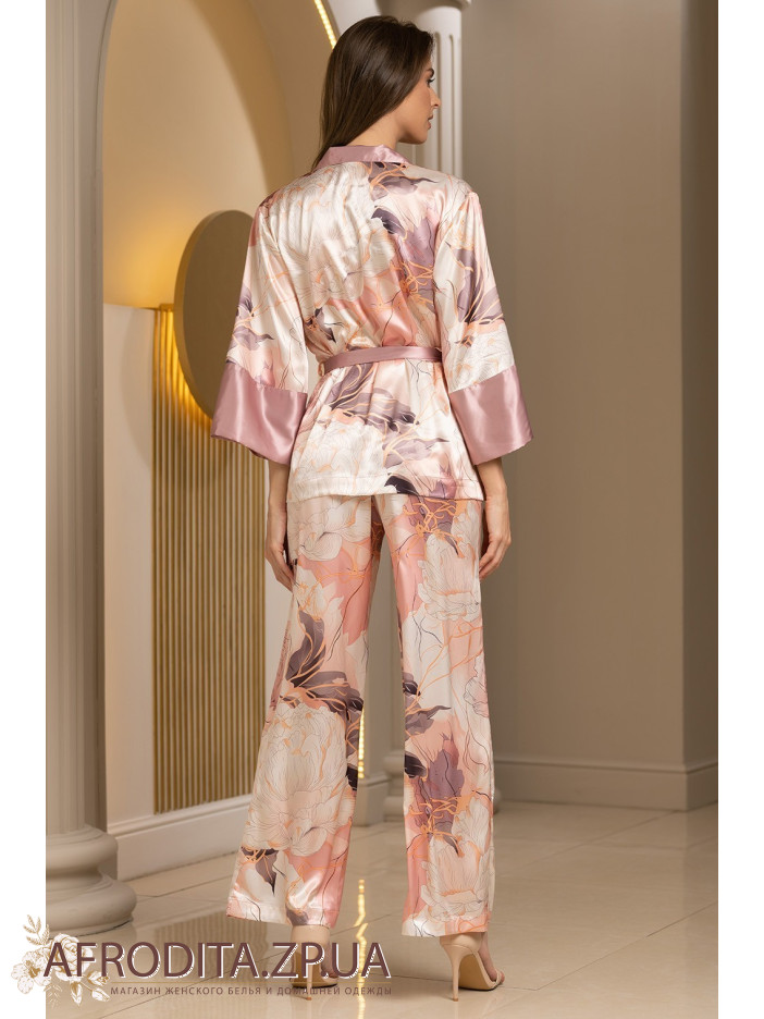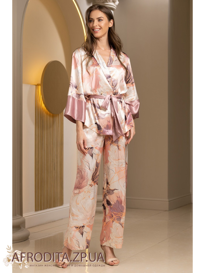 Комплект зі штанами Півонії 4215 від Mia-Amore виконаний із сумішевого шовку. Вільний жакет із застібкою на гудзики та штани з принтованого шовку. Низ рукавів, комір та пояс виконані з однотонного шовку. По талії жакет регулюється за допомогою пояса, що принтує. Штани вільного силуету виготовлені із принтованого сумішевого шовку.