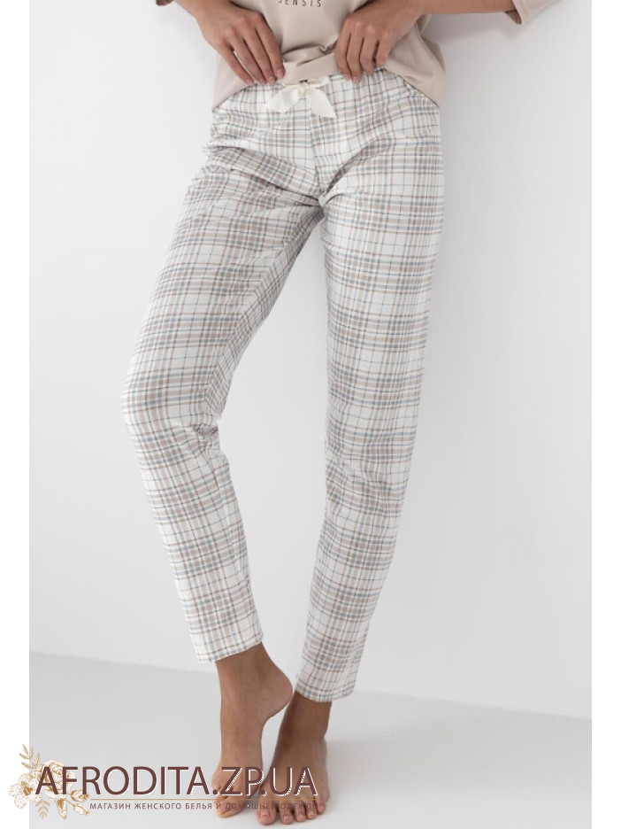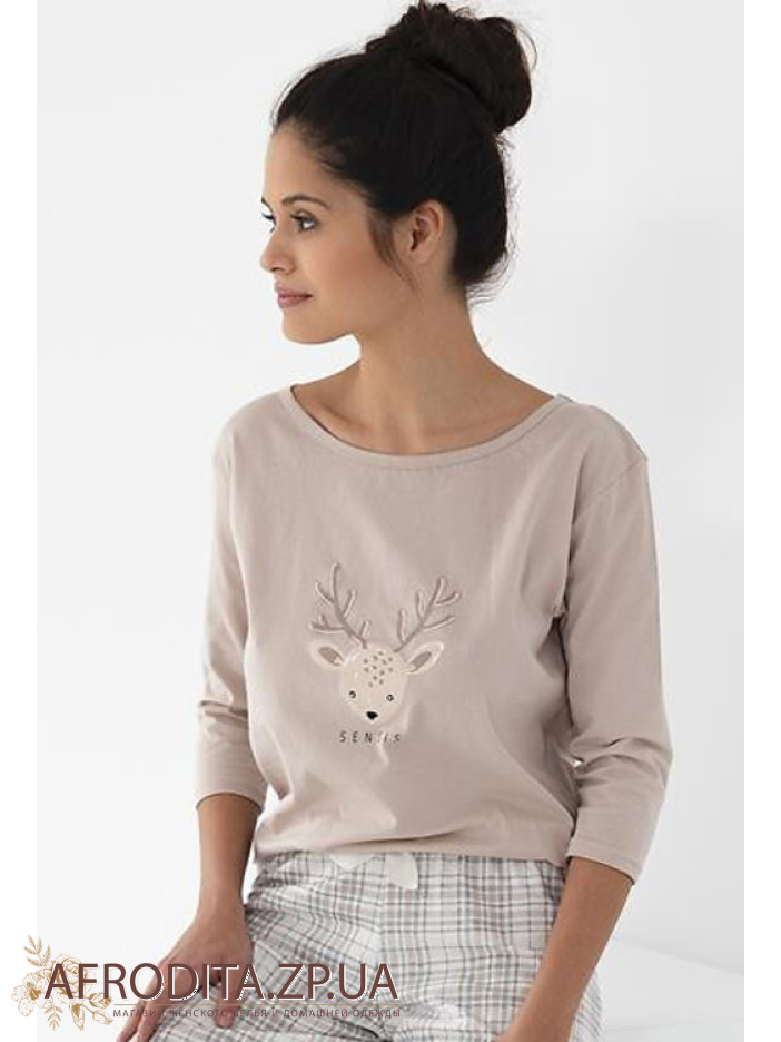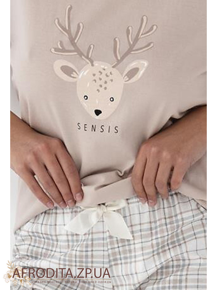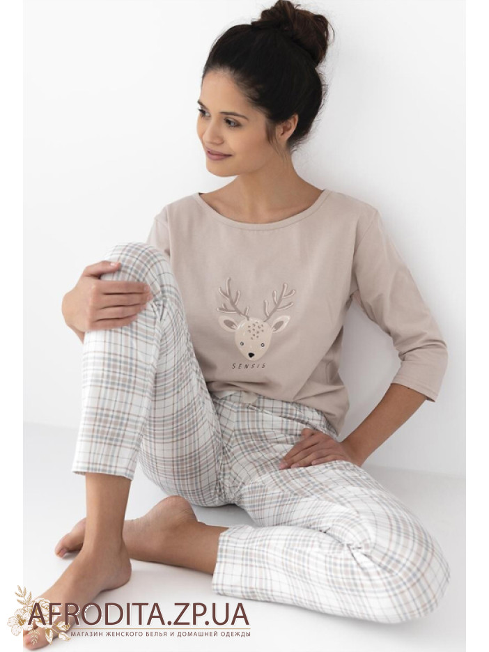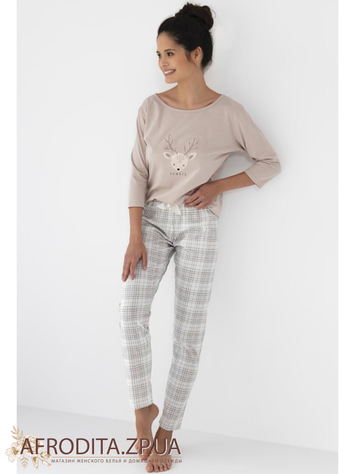 Жіноча піжама зі штанами Sensis Gaia з бавовни. У комплект входить джемпер бежевого кольору з рукавом 3/4, передня частина прикрашена зображенням у вигляді оленя. Штани на резинці у клітку, по центру розташований бантик.